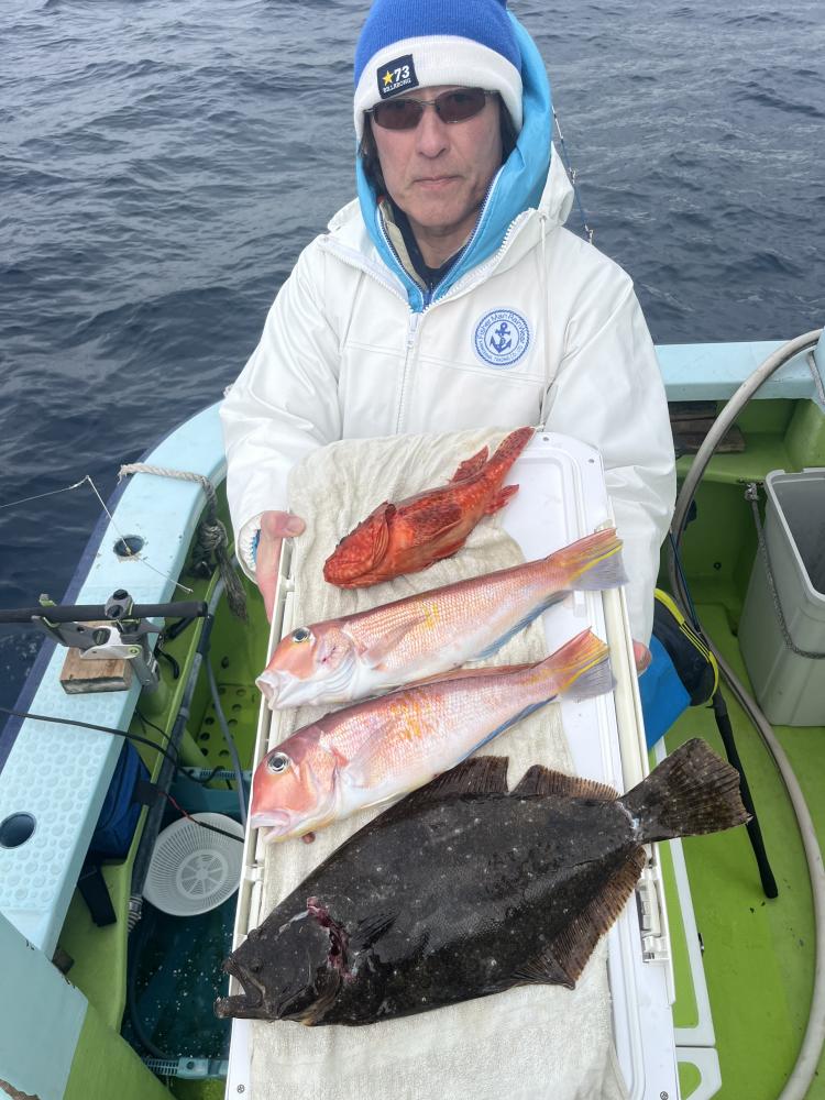 ヒラメ船中6枚、アマダイ良型混じりで何とか見れて他オニカサゴ、キダイ。