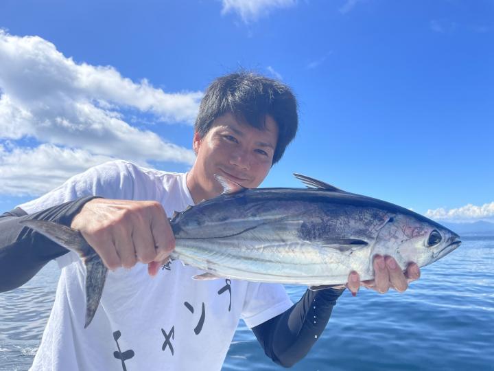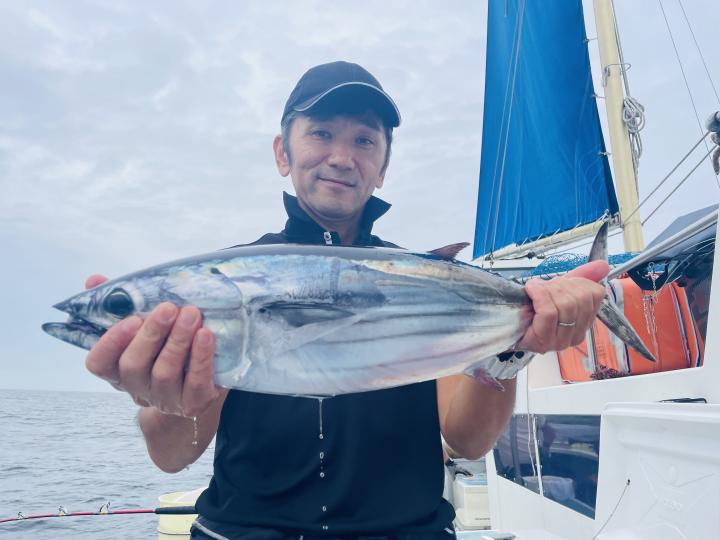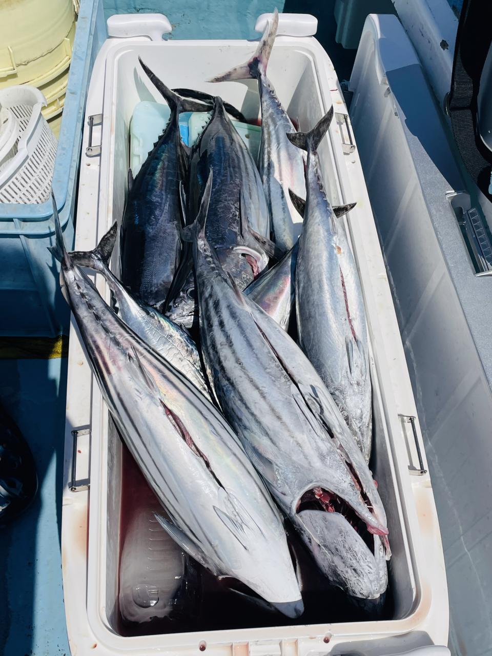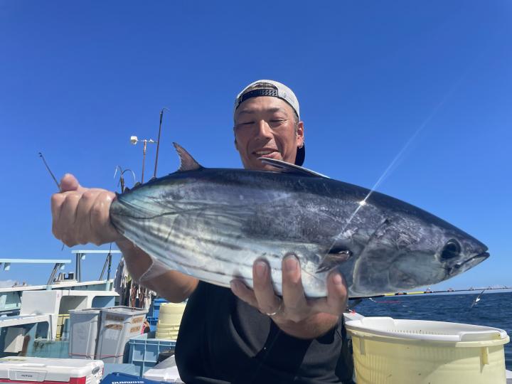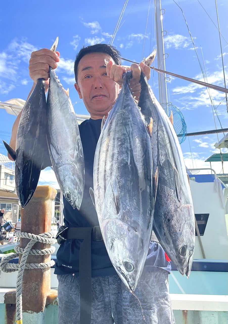 朝からカツオ主体にナブラ浮き⤴︎︎︎ 1投目から良型カツオ中心にデカヒラソウダ混じりで バリバリっとアタリ到来♪ その後 日中でもカツオを中心にヒラソウダ混じりでアタリが続き〜コマセ9名様 全員カツオキャッチ成功⭕️ コマセでキメジもヒット有!最大5.9kgをトップ2本!!