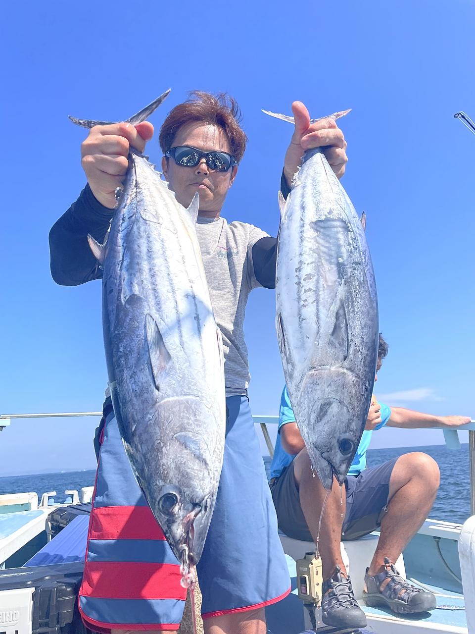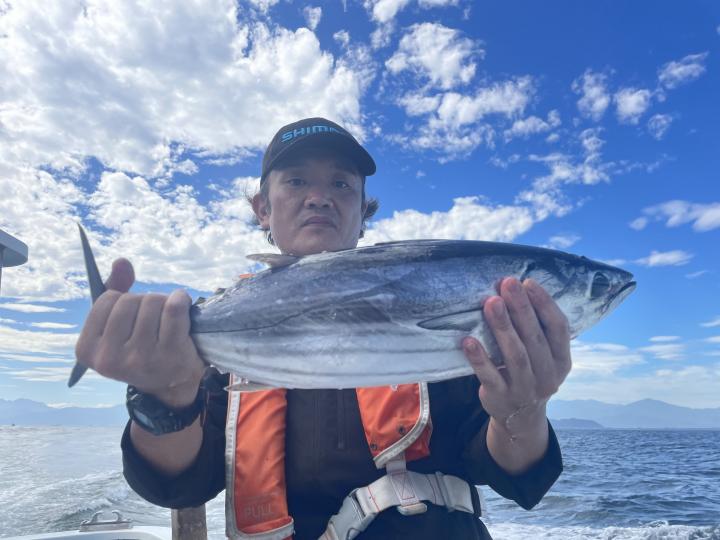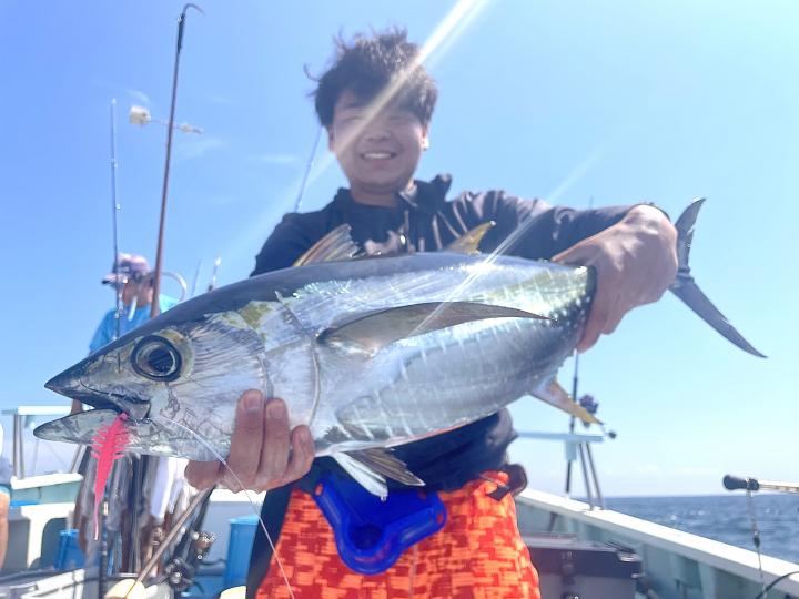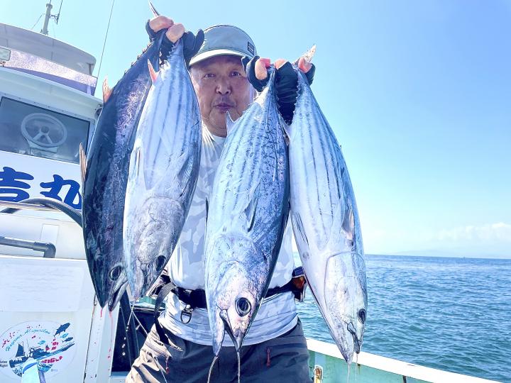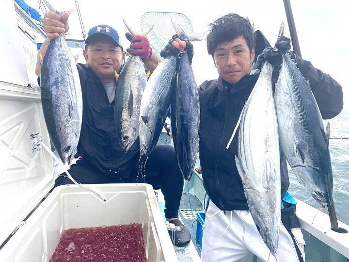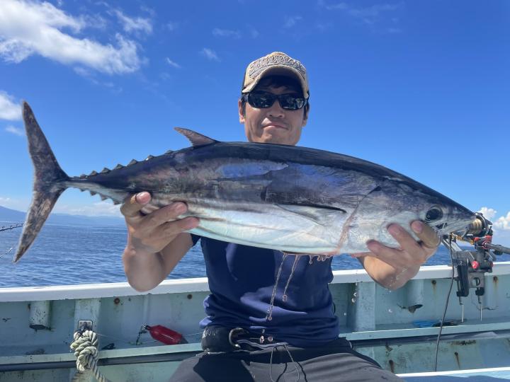 朝からカツオ主体にナブラ浮き⤴︎︎︎ 1投目から良型カツオ中心にデカヒラソウダ混じりで バリバリっとアタリ到来♪ その後 日中でもカツオを中心にヒラソウダ混じりでアタリが続き〜コマセ9名様 全員カツオキャッチ成功⭕️ コマセでキメジもヒット有!最大5.9kgをトップ2本!!
