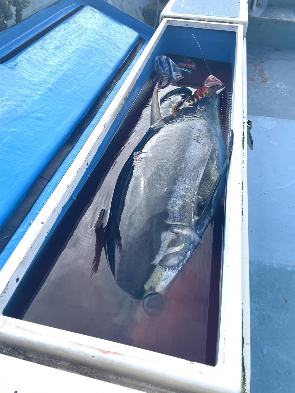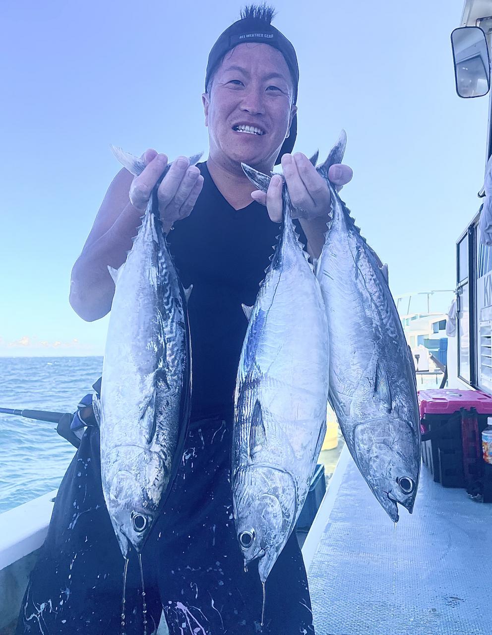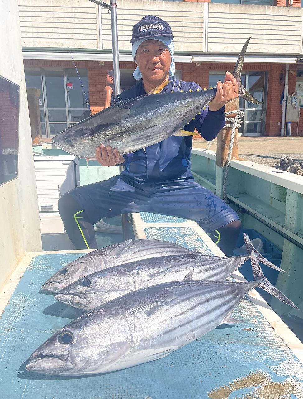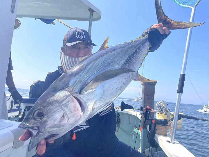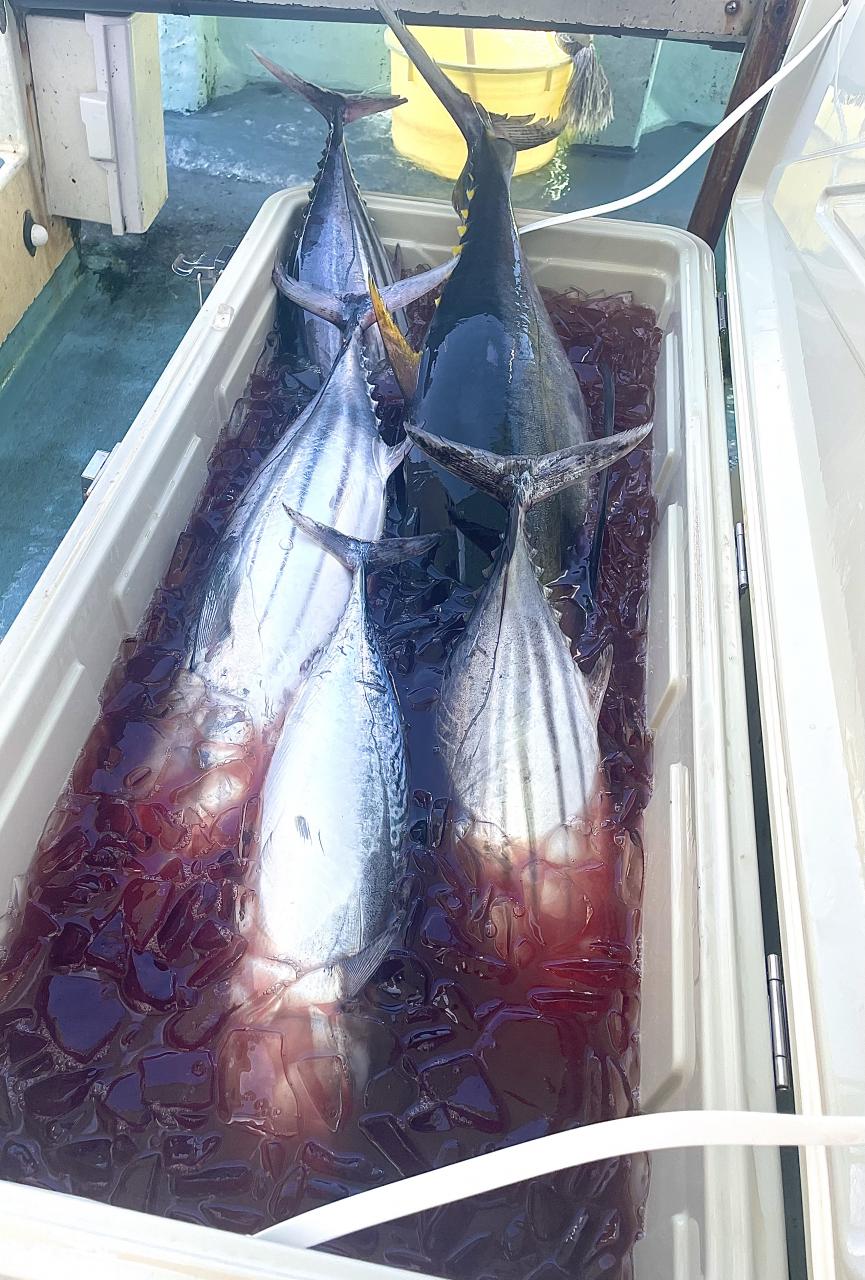 朝はマグロ探索で 時間かかりましたが 群れが見つかり 流し釣りスタート! 開始早々から船にマグロが付き リーチ状態♪ しかし なかなか針に食いつかず根気よくコマセ撒き撒きして より多くのマグロを寄せ集め…瞬殺からの 9時半にようやく無事1本目GET!その後も移動せず流し釣り継続&船の周りはマグロ畑♪ 昼過ぎにかけてヒットが続き 合計4発ヒットで 3本キャッチ〇