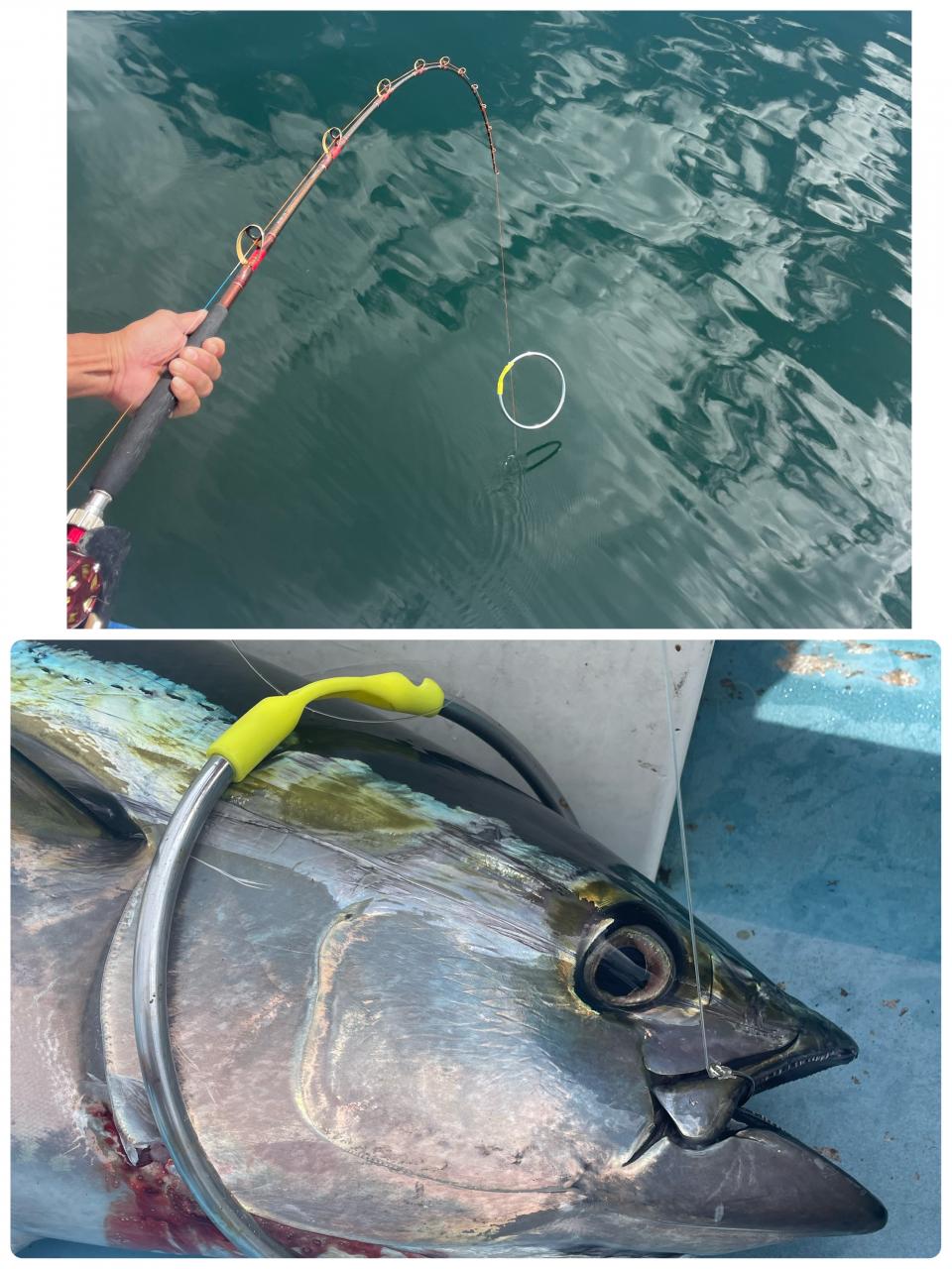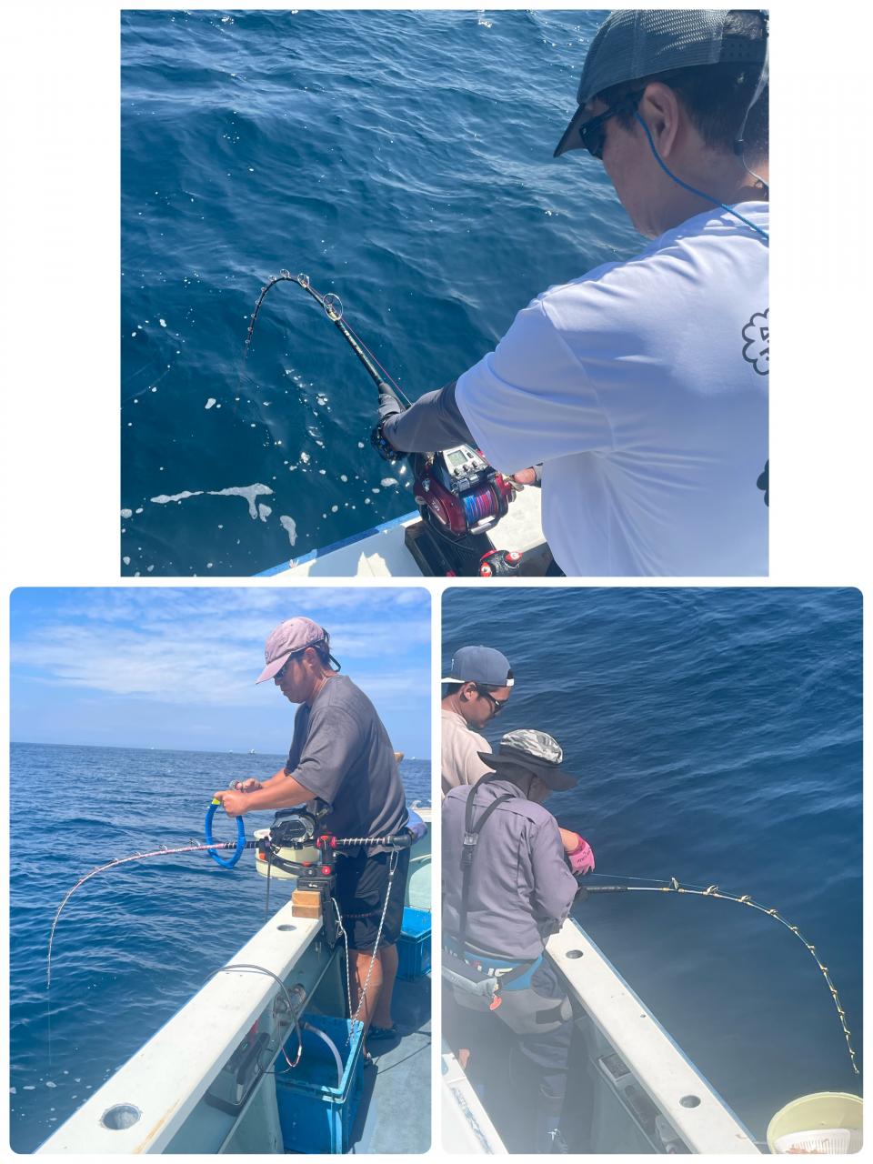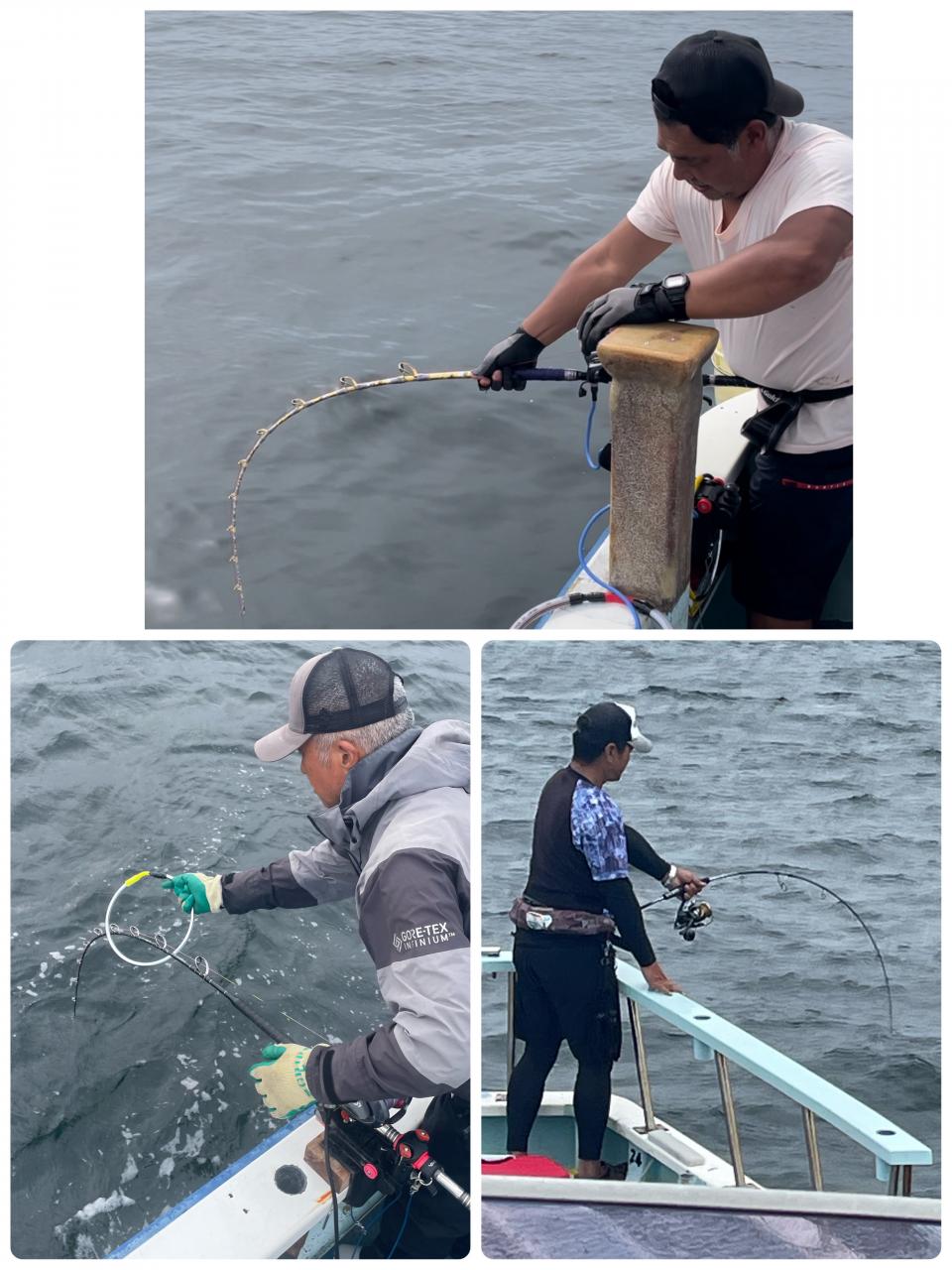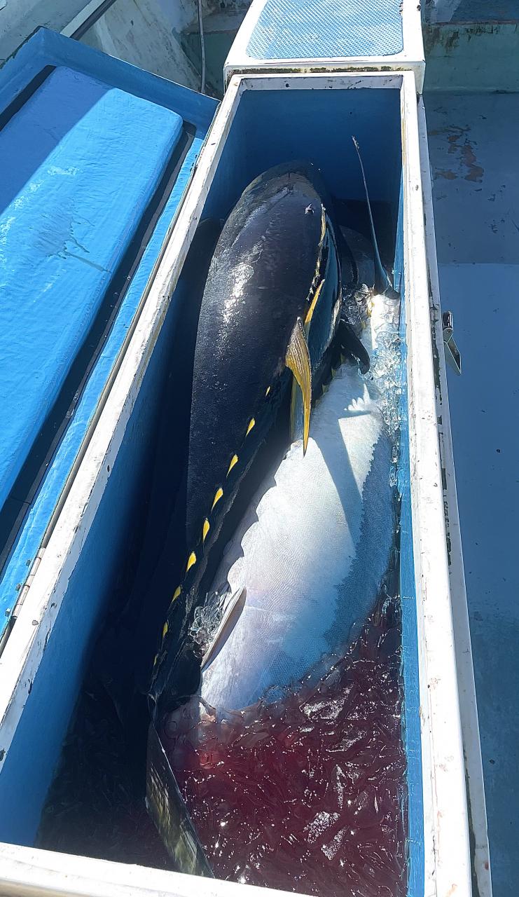 朝はマグロ探索で 時間かかりましたが 群れが見つかり 流し釣りスタート! 開始早々から船にマグロが付き リーチ状態♪ しかし なかなか針に食いつかず根気よくコマセ撒き撒きして より多くのマグロを寄せ集め…瞬殺からの 9時半にようやく無事1本目GET!その後も移動せず流し釣り継続&船の周りはマグロ畑♪ 昼過ぎにかけてヒットが続き 合計4発ヒットで 3本キャッチ〇