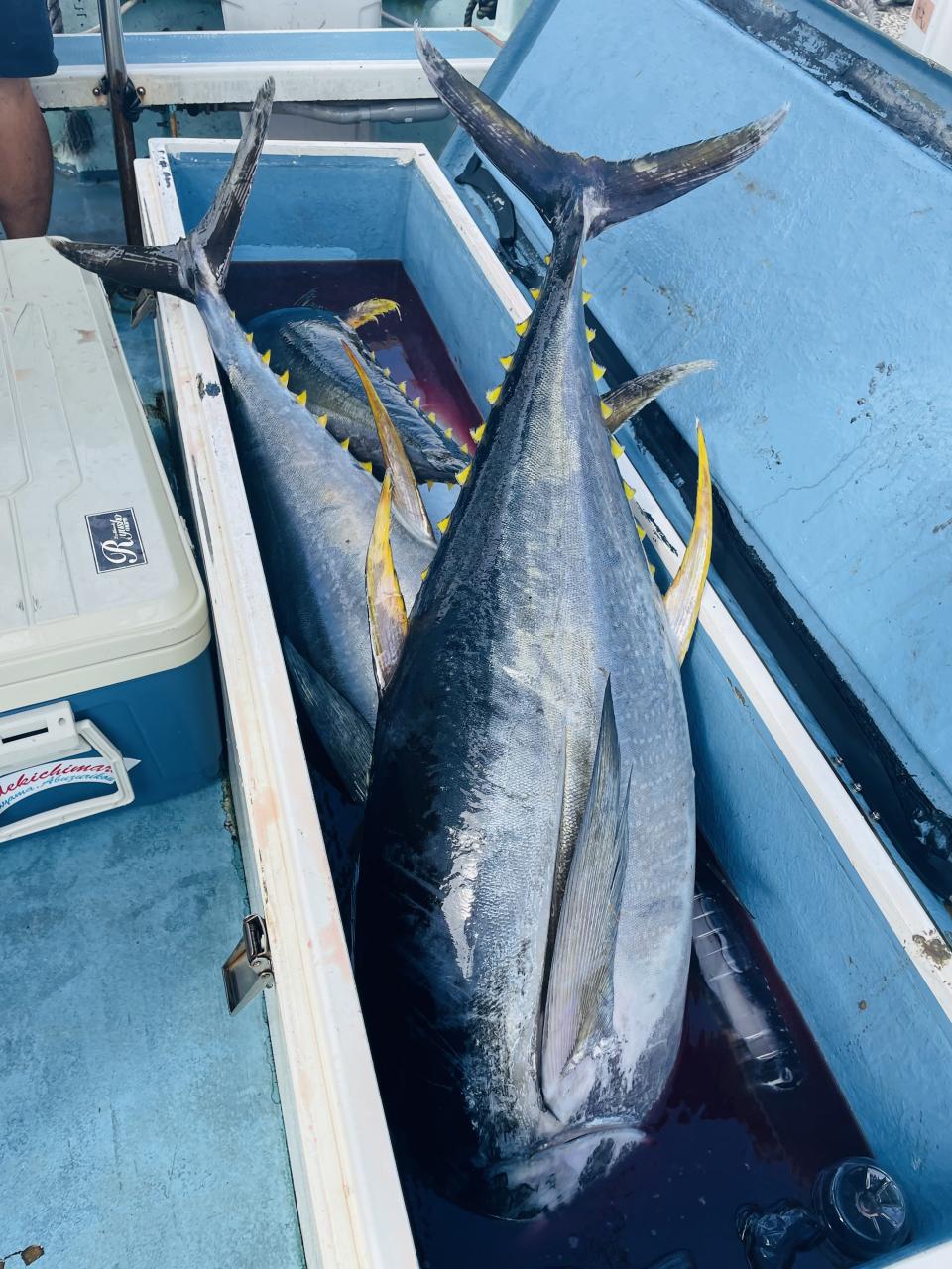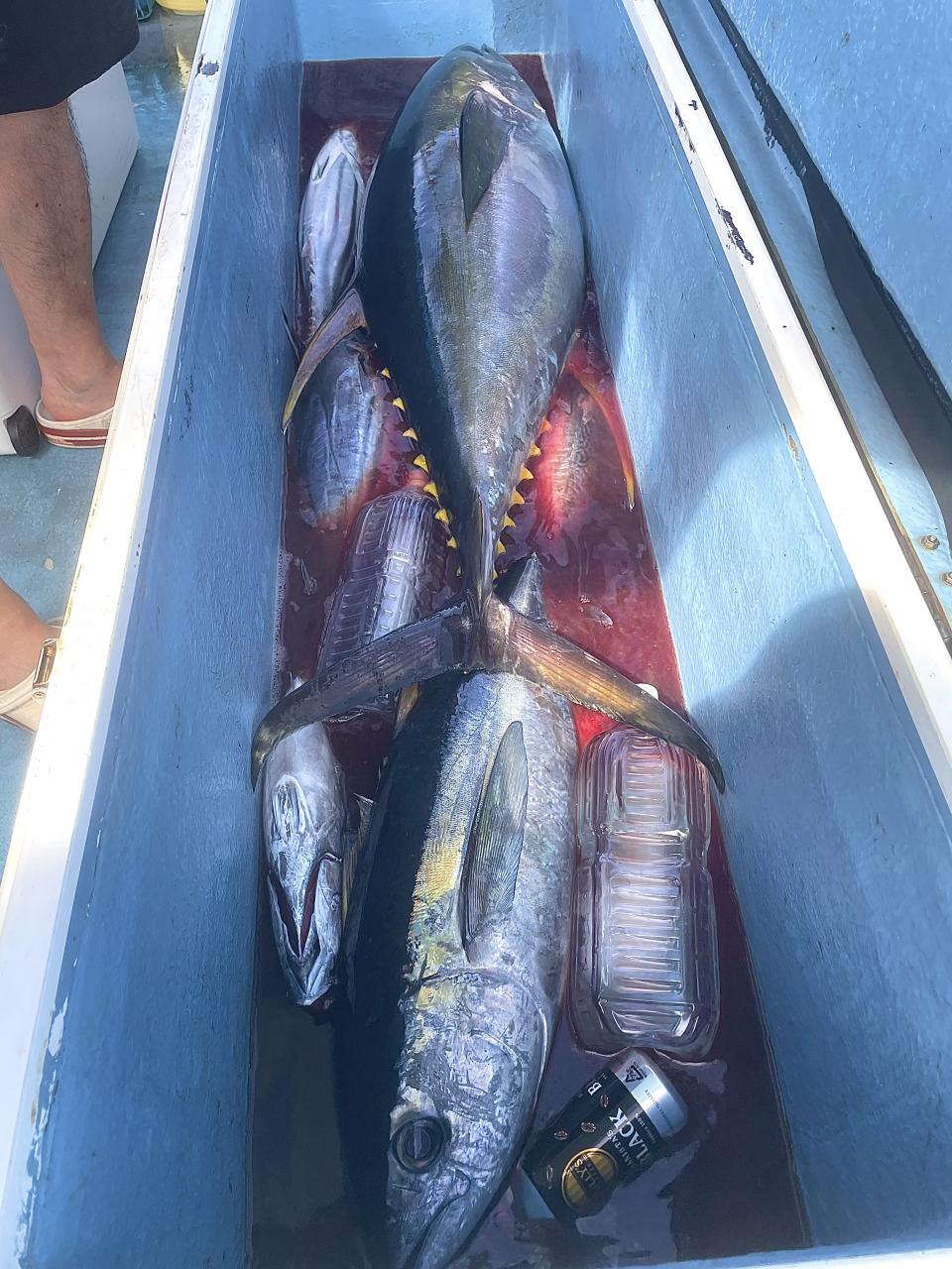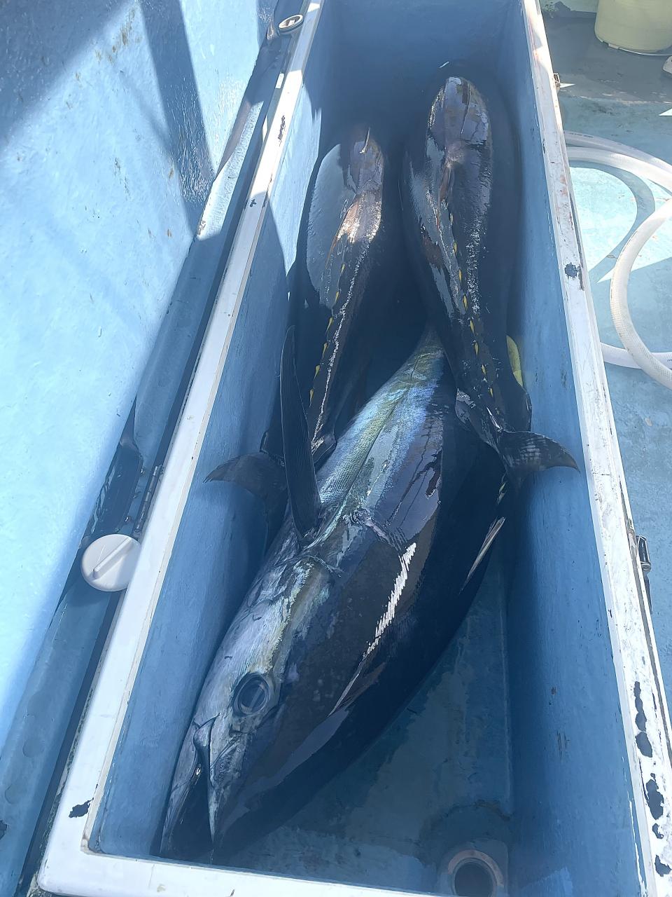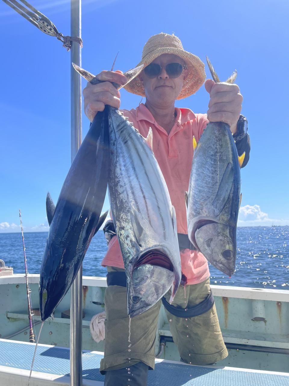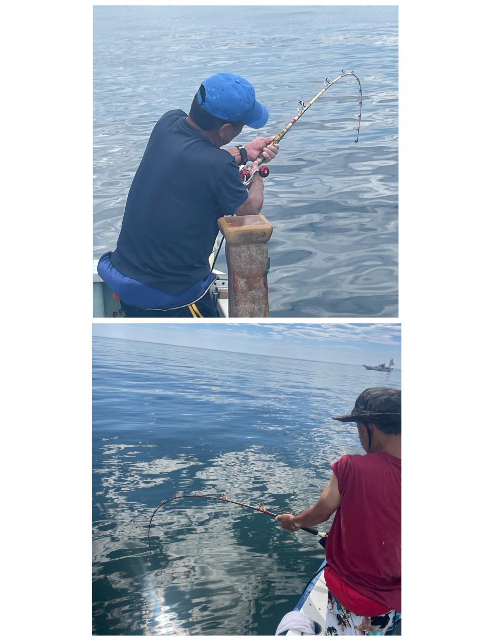 朝はマグロ探索で 時間かかりましたが 群れが見つかり 流し釣りスタート! 開始早々から船にマグロが付き リーチ状態♪ しかし なかなか針に食いつかず根気よくコマセ撒き撒きして より多くのマグロを寄せ集め…瞬殺からの 9時半にようやく無事1本目GET!その後も移動せず流し釣り継続&船の周りはマグロ畑♪ 昼過ぎにかけてヒットが続き 合計4発ヒットで 3本キャッチ〇