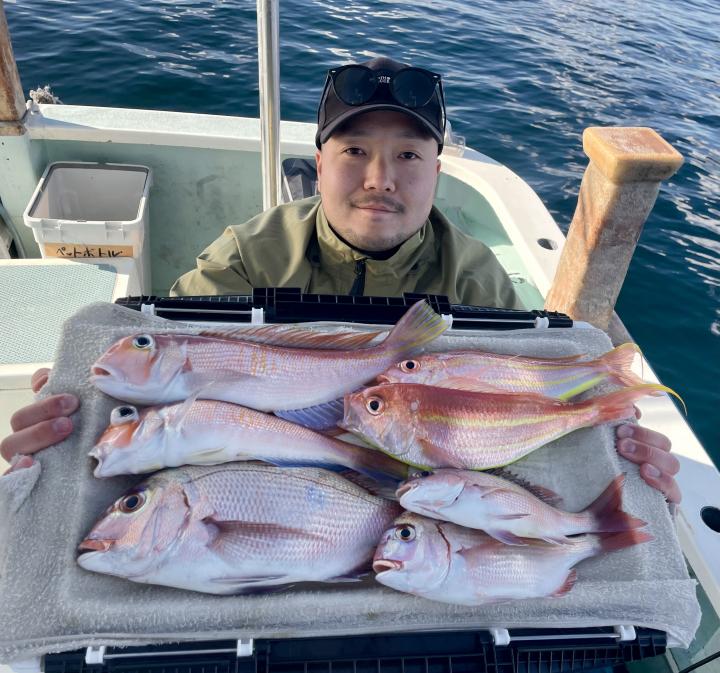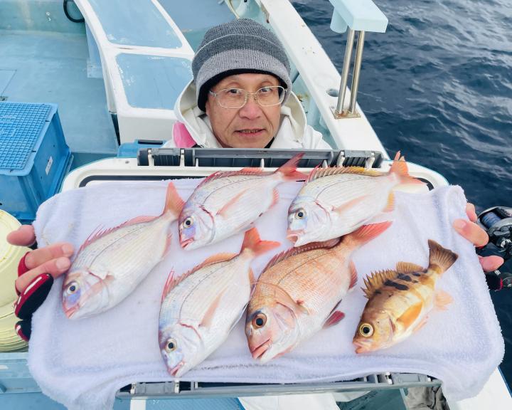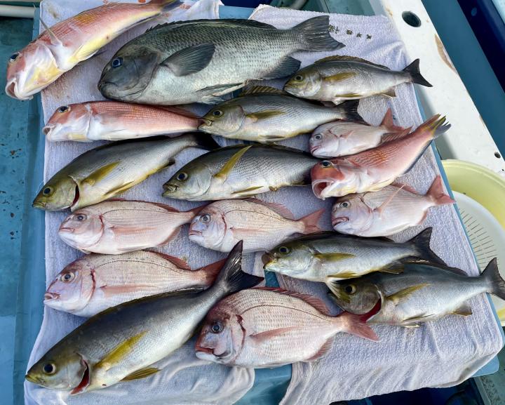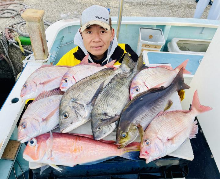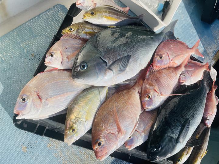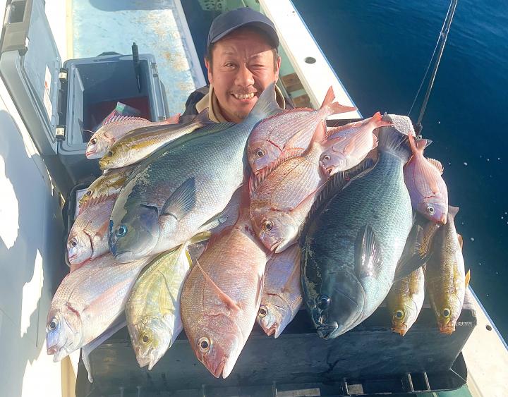 タイ五目は マダイ最大1.7kg、1.6kgを筆頭に ハナダイ混じりでトップ5枚キープ♪ ゲストに カンパチ、カイワリ、メジナ、イトフエフキダイ、イトヨリ、サバ等