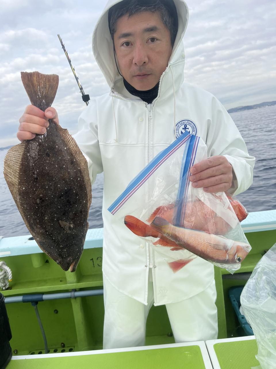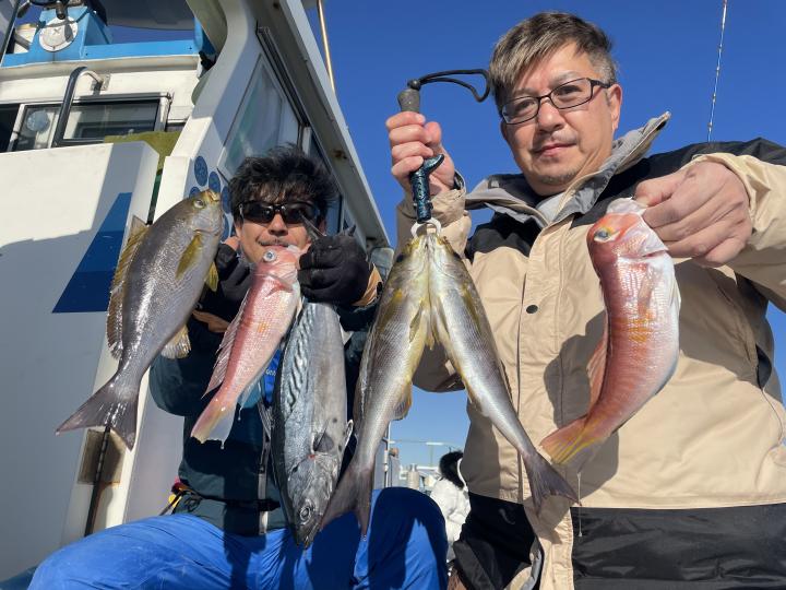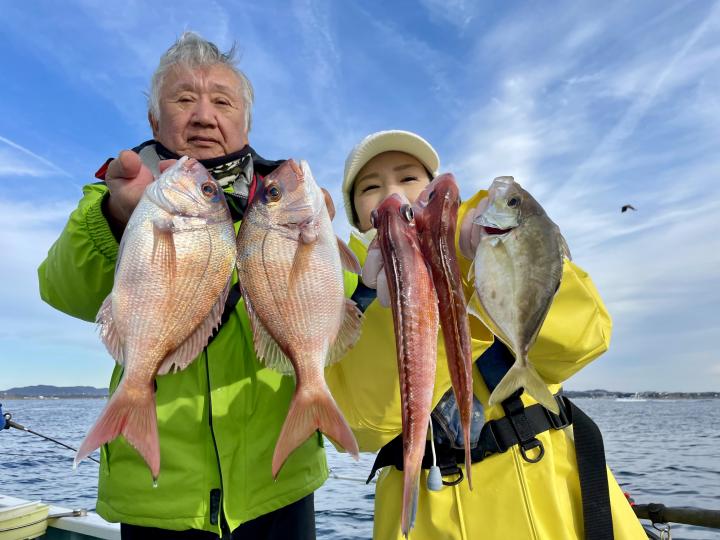 アマダイは今日は少人数なので、深場を狙い アカアマダイをトップ2枚が2名様!ゲストにカイワリ、ホウボウ、ウマズラハギ、サバにコウイカまで登場!(オキアミに抱きついてきました笑)