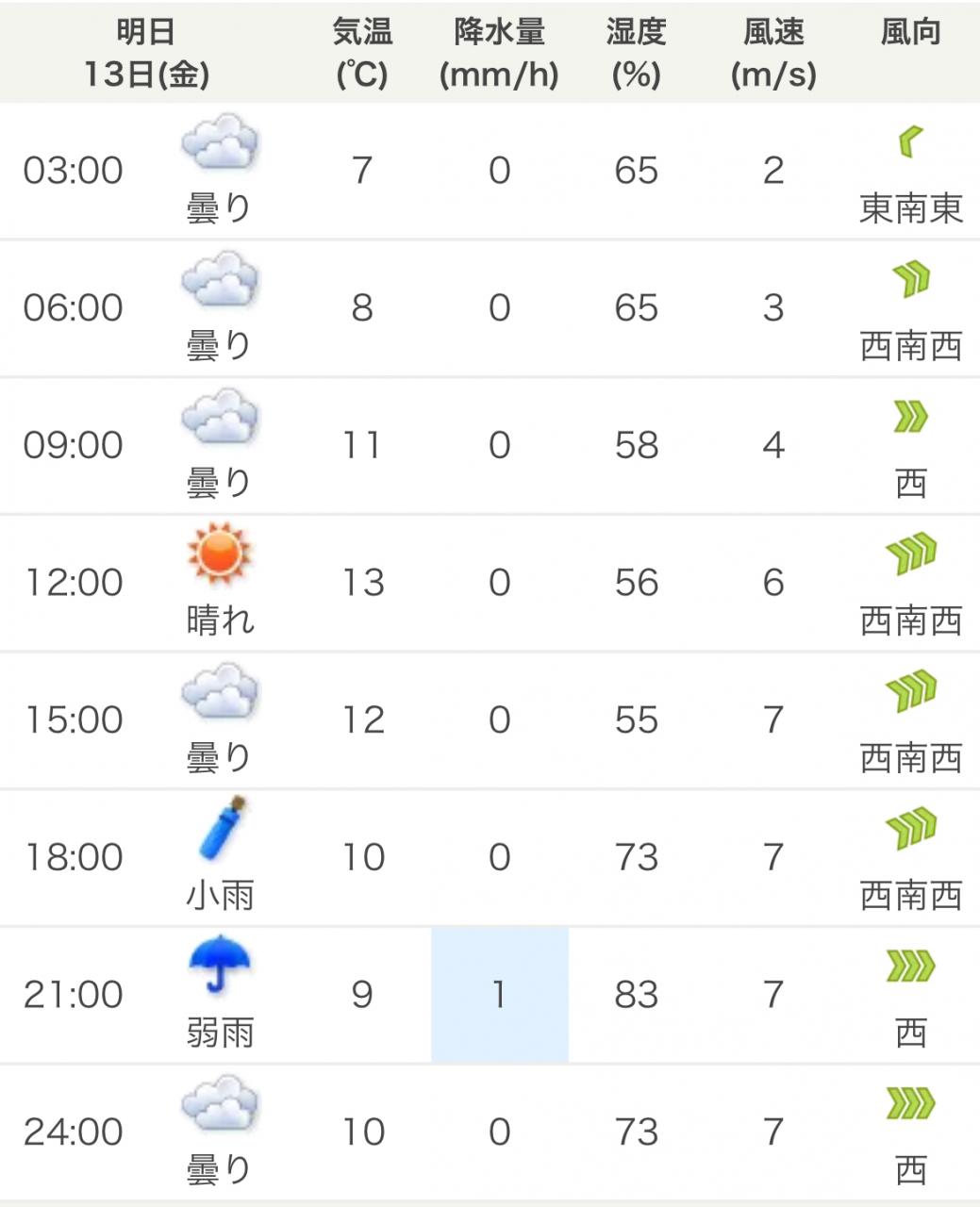 風向きと強さ:北東 弱い→北西 弱い