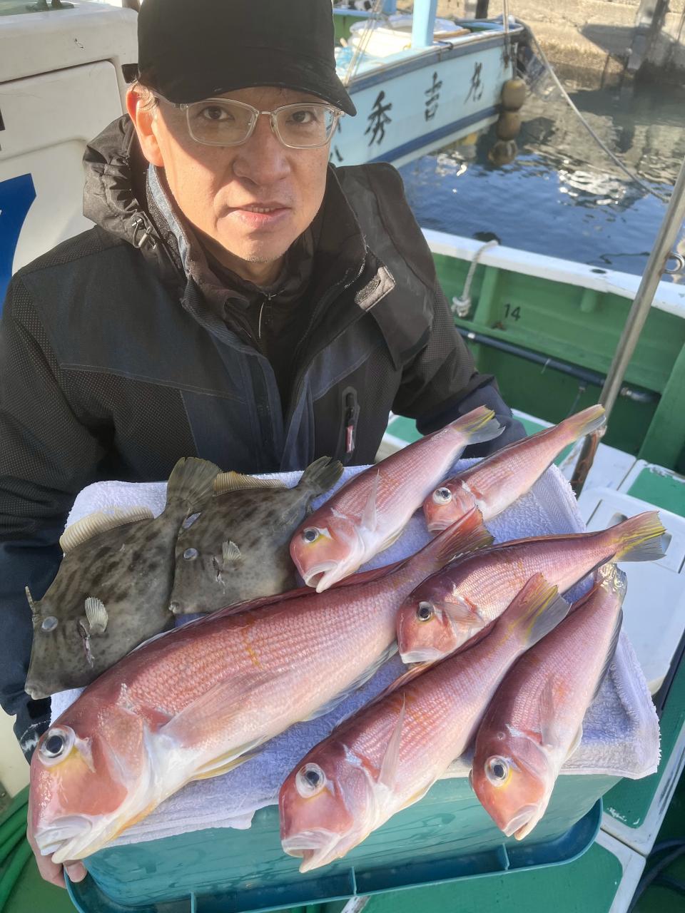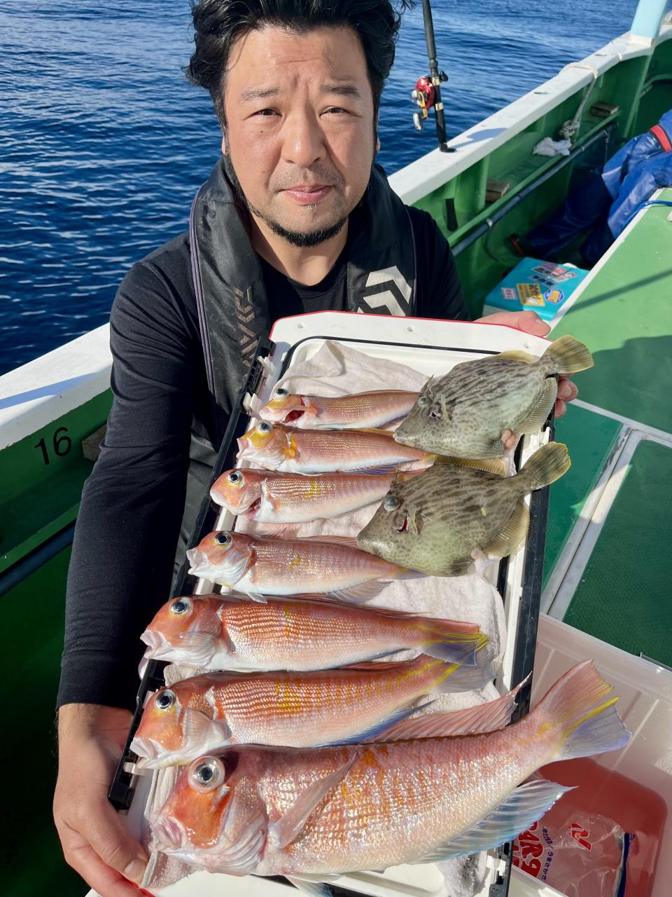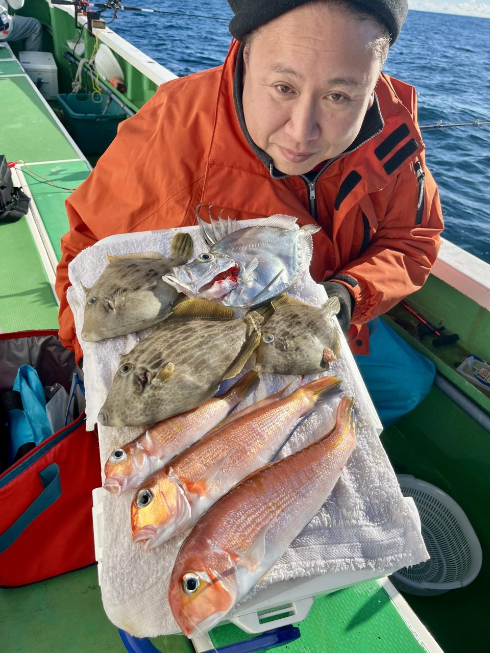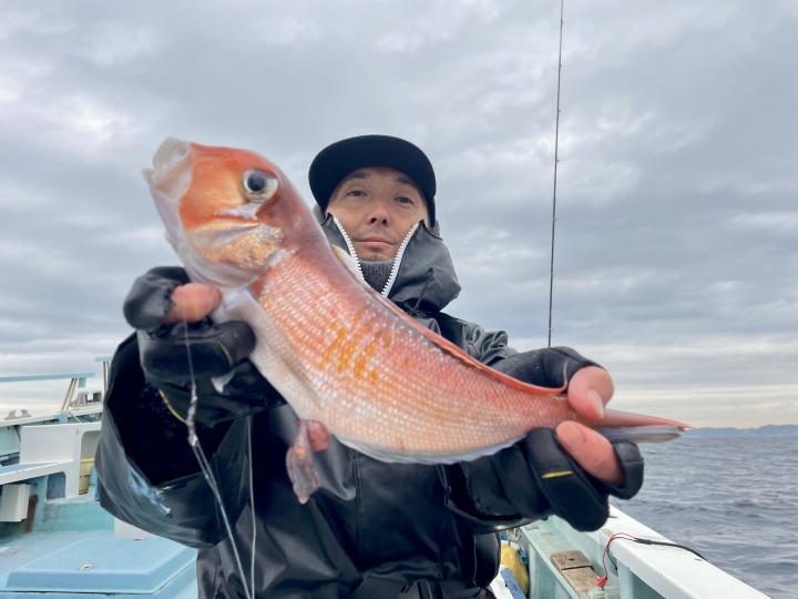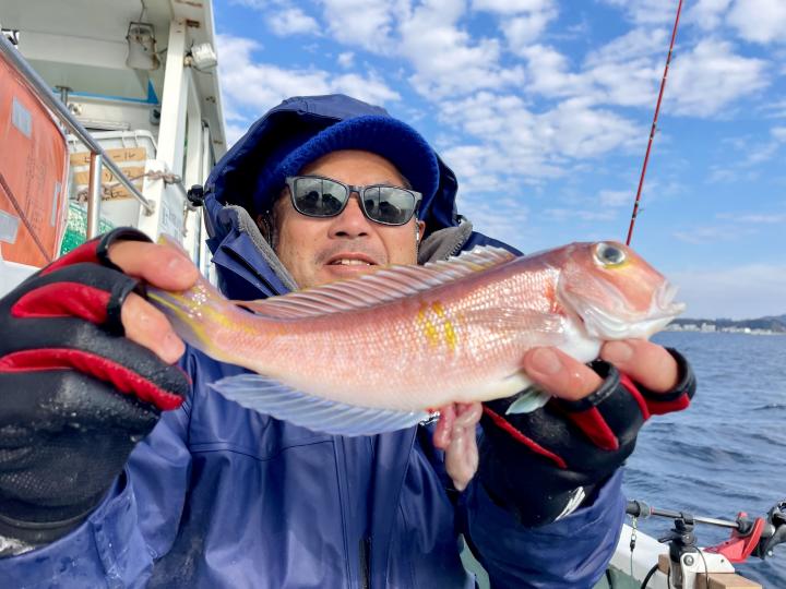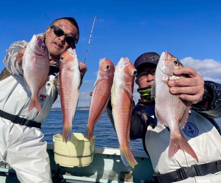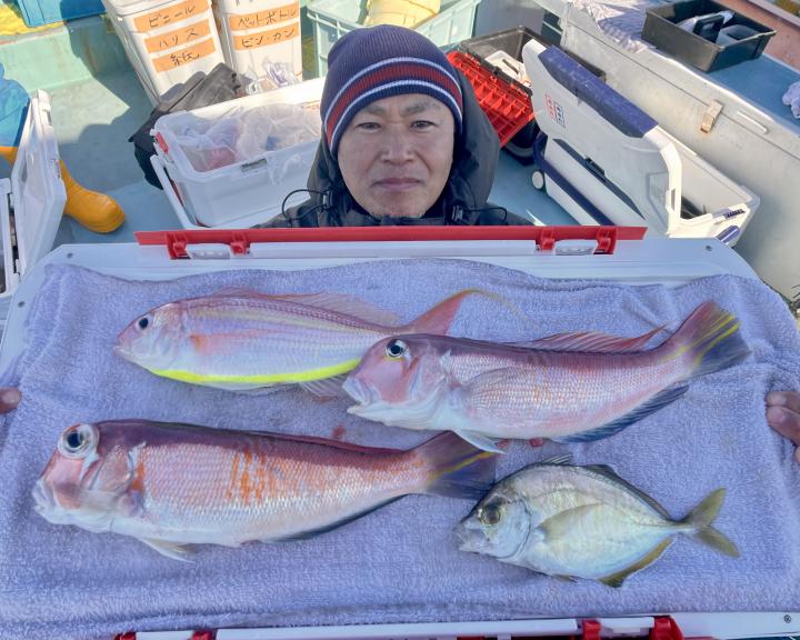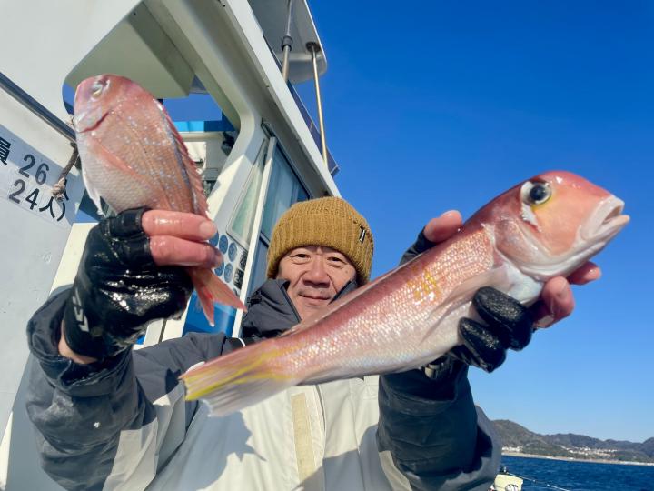 アマダイへシフトチェンジすると 潮流れ適度に本命アマダイ良型中心(35cm~40cm級)にポツポツと最後の1投目まで釣れ上がり⤴︎︎ 正味2時半ながらトップ5枚!! 【船中18枚】と絶好釣〜♪ ゲストにキダイ、イトヨリ、カイワリも!