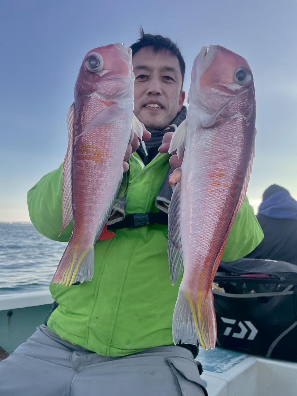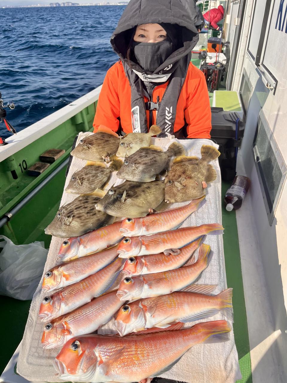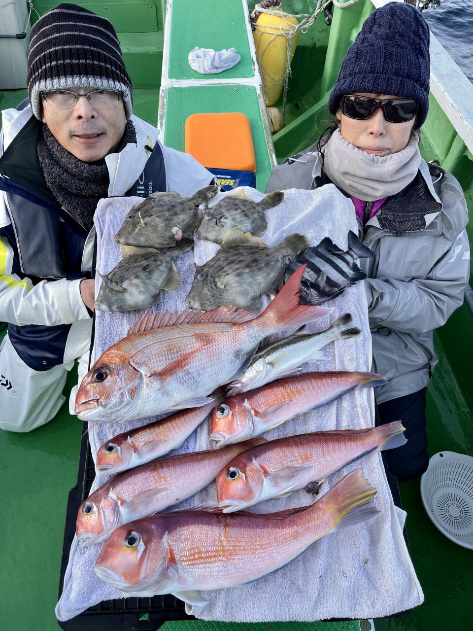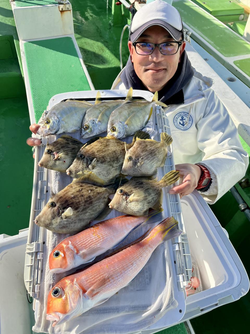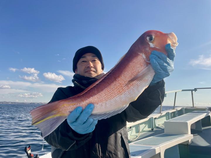 アマダイへシフトチェンジすると 潮流れ適度に本命アマダイ良型中心(35cm~40cm級)にポツポツと最後の1投目まで釣れ上がり⤴︎︎ 正味2時半ながらトップ5枚!! 【船中18枚】と絶好釣〜♪ ゲストにキダイ、イトヨリ、カイワリも!