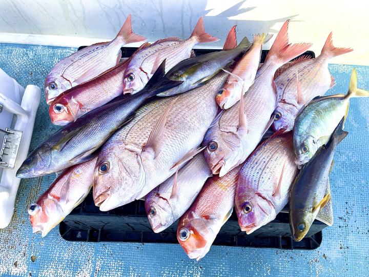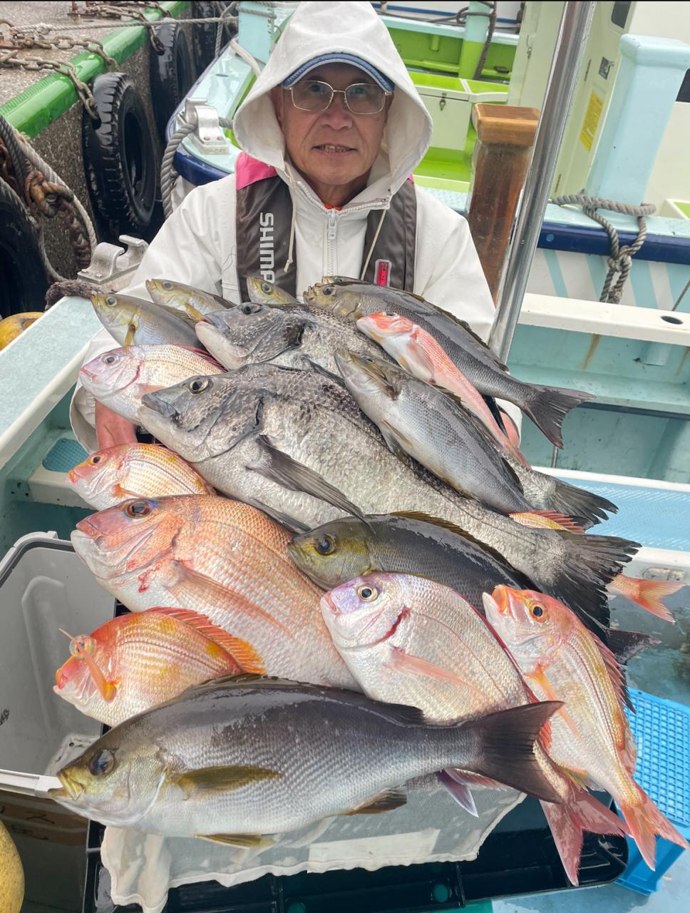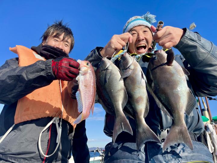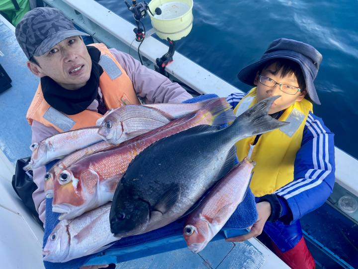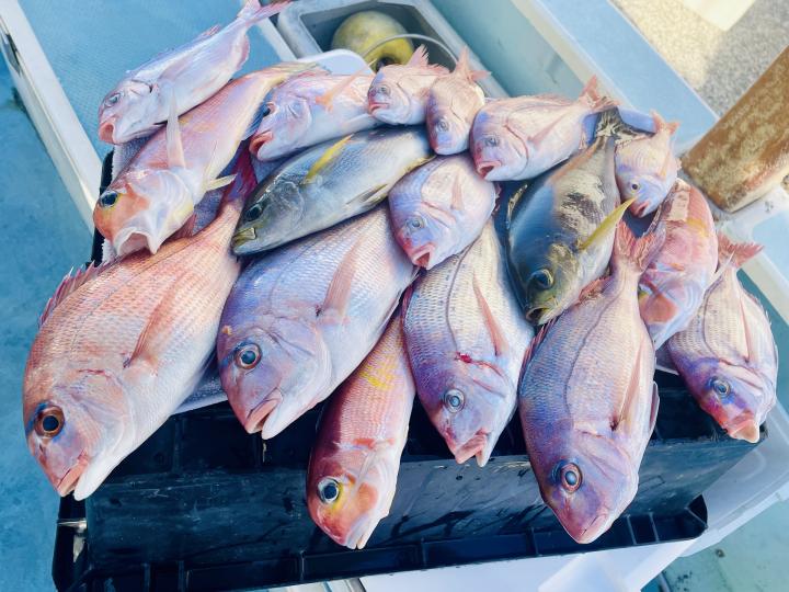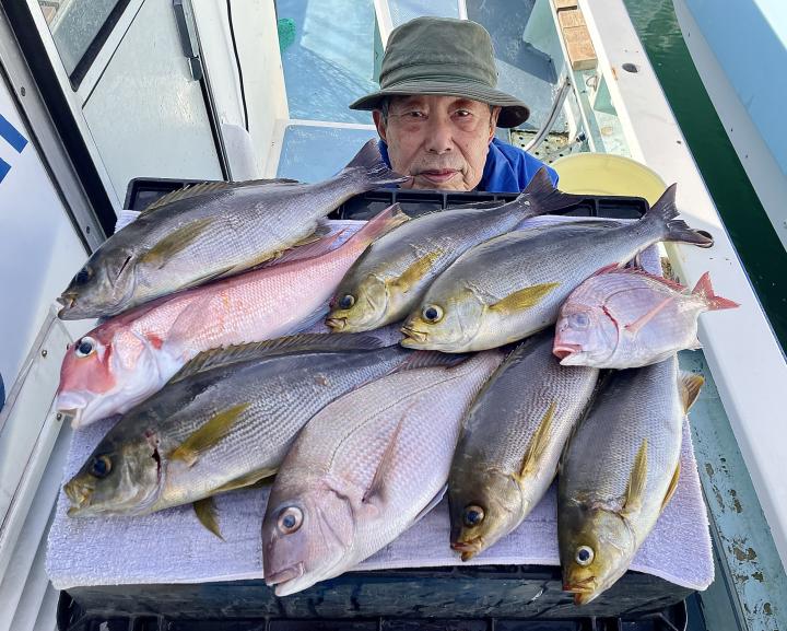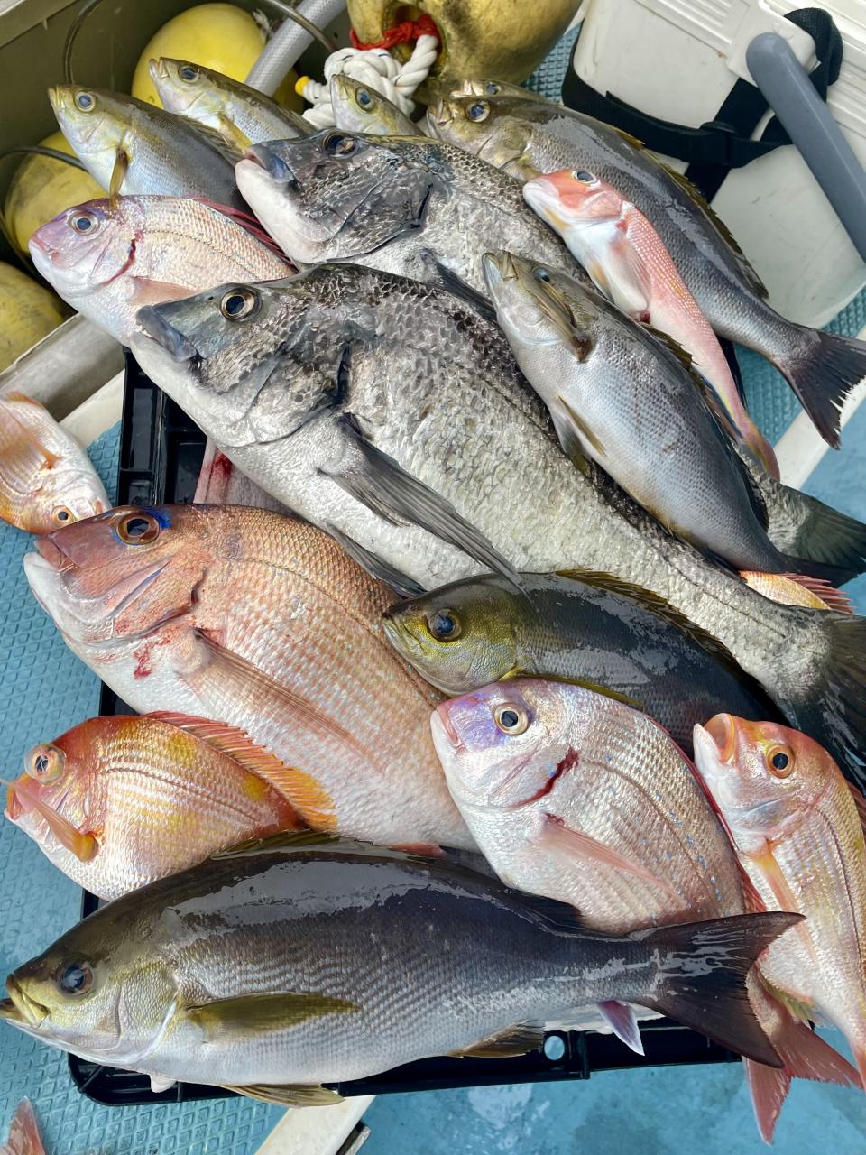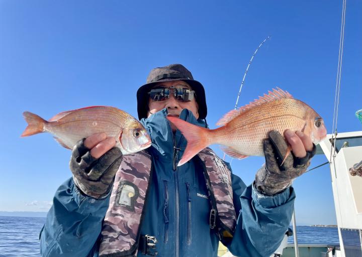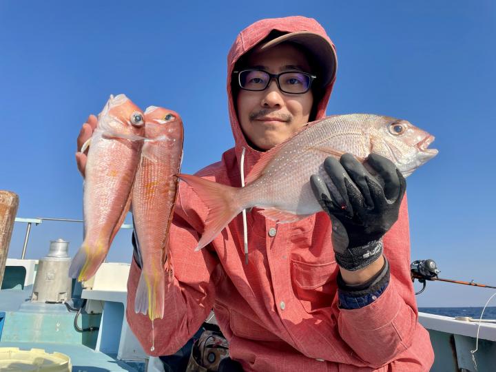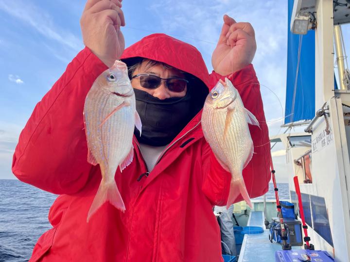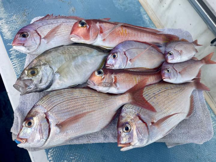タイ五目は マダイ・ハナダイ主体に反応確認✓ 『テーパー細ハリス2号8m2本針』有利にて トップ3枚、2番手2枚2名様!ゲストにイトフエフキダイ、カサゴ等
