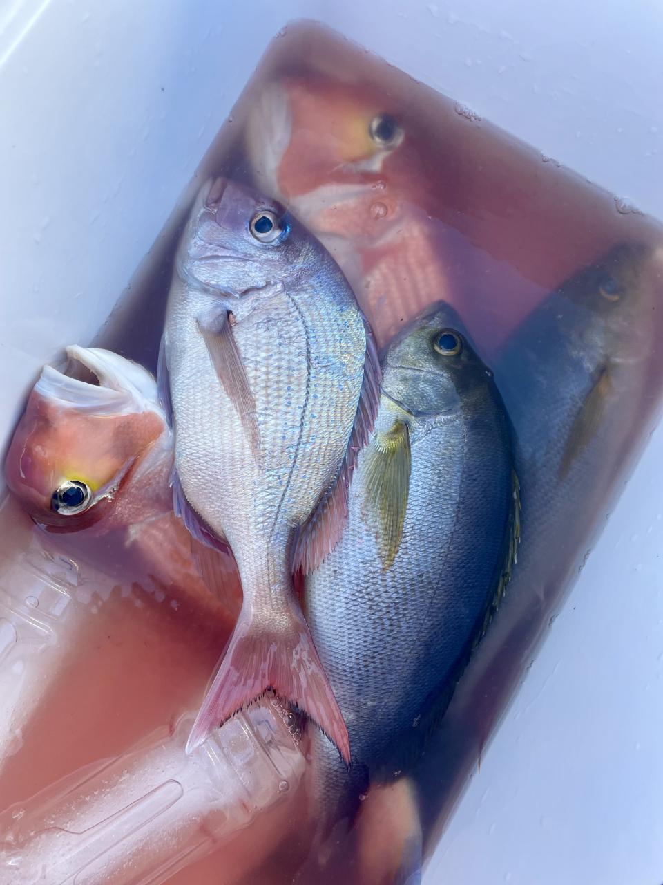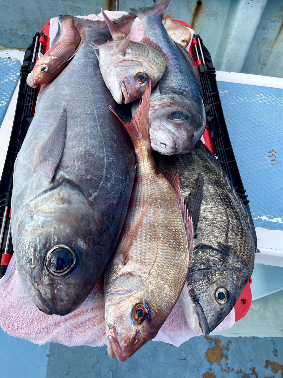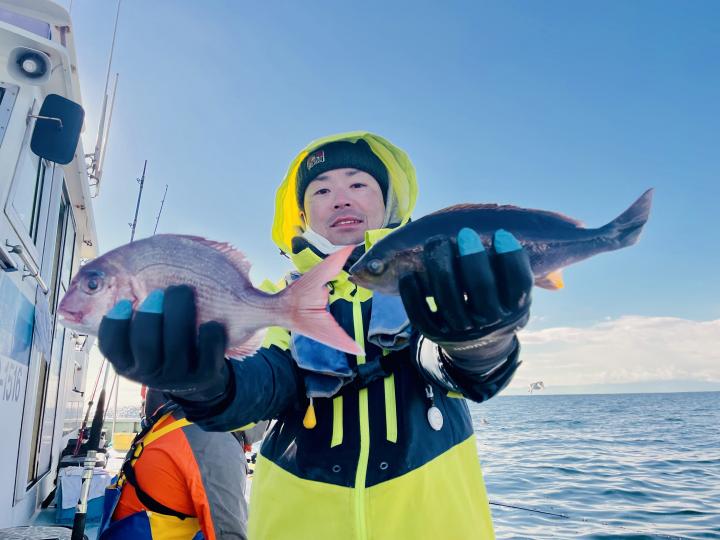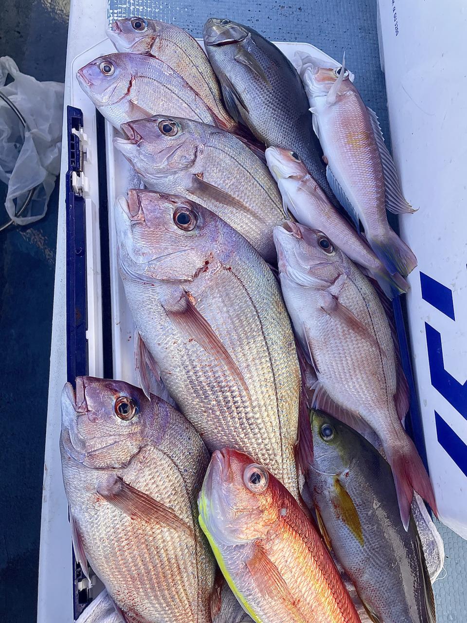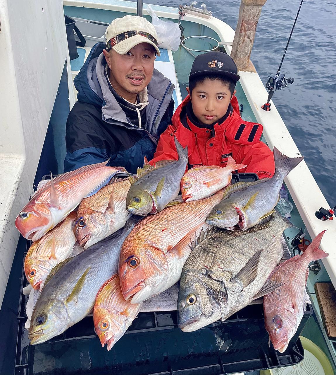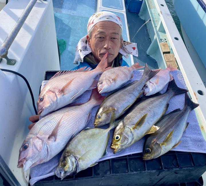 タイ五目は マダイ・ハナダイ主体に反応確認✓ 『テーパー細ハリス2号8m2本針』有利にて トップ3枚、2番手2枚2名様!ゲストにイトフエフキダイ、カサゴ等
