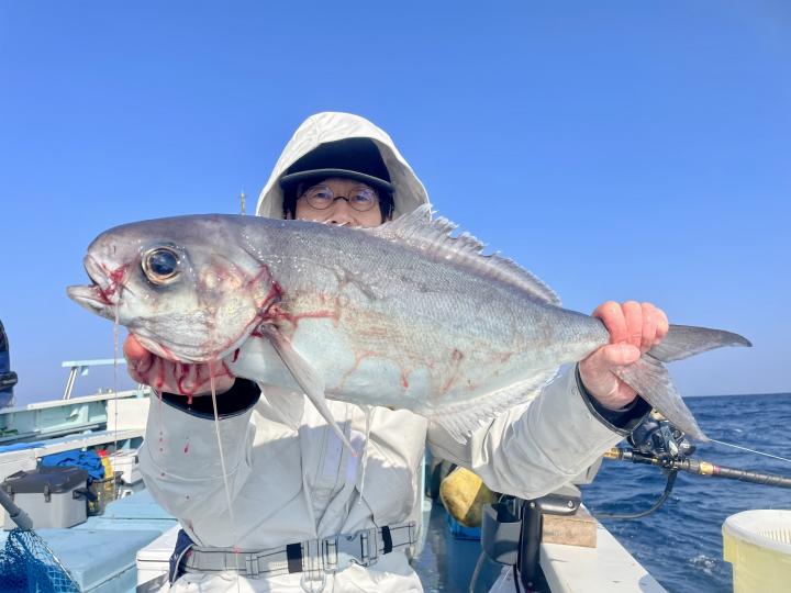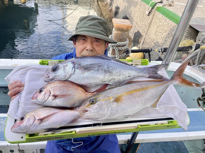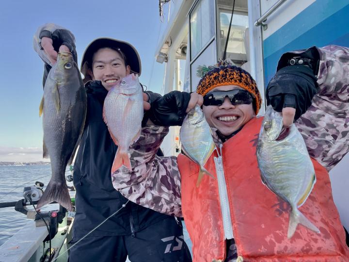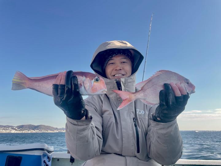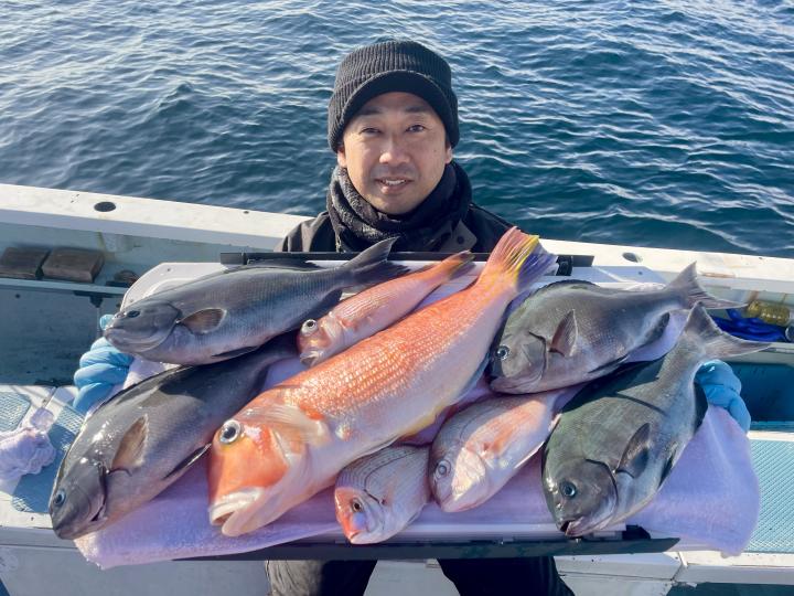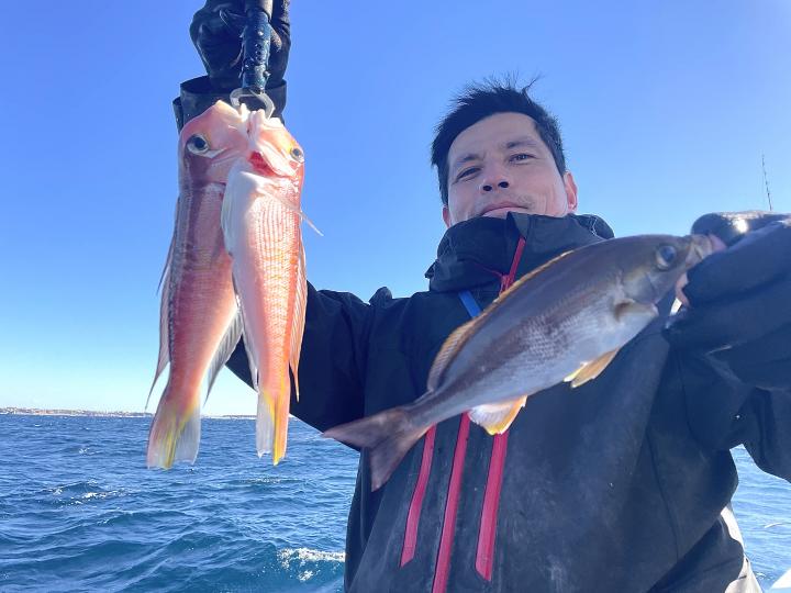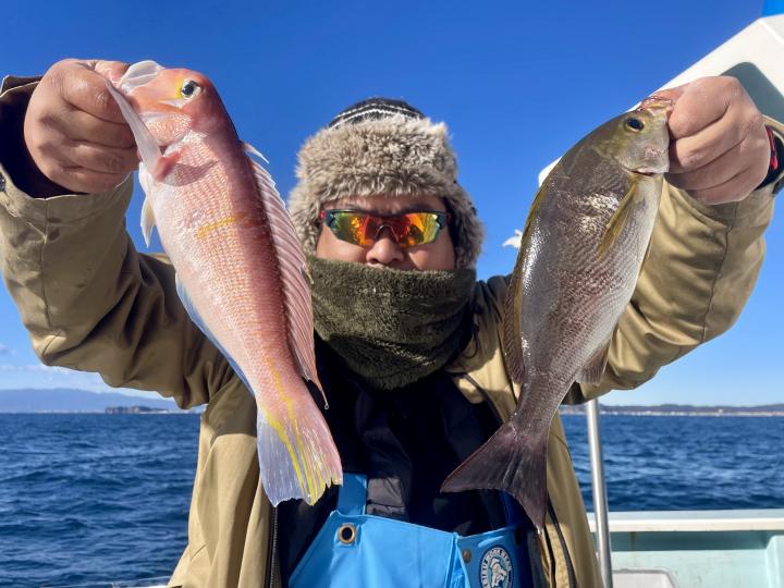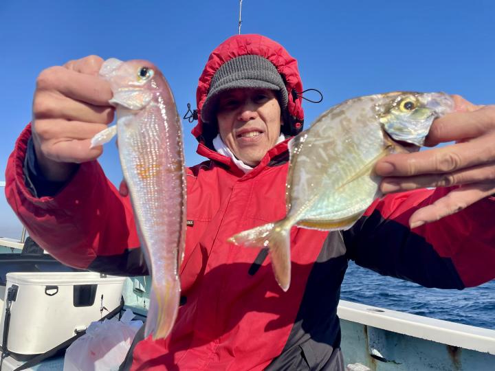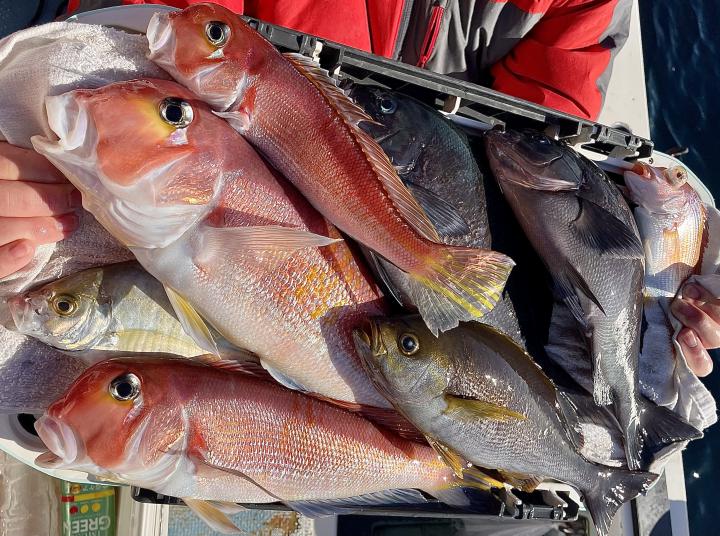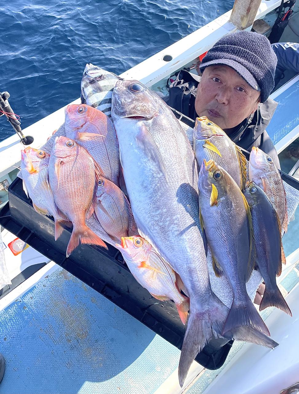 二枚潮で船内オマツリ多発で苦戦ながら 仕掛けが降りれば何かしらアタリ活発!!ほぼ入れ食い〜♪ 本命アマダイは船中7枚(トップ2枚)も、キダイ多数、良型カイワリ、サバにキントキダイまで登場⤴︎︎ 今後も風が穏やかな日和には遠方漁場へご案内致します!