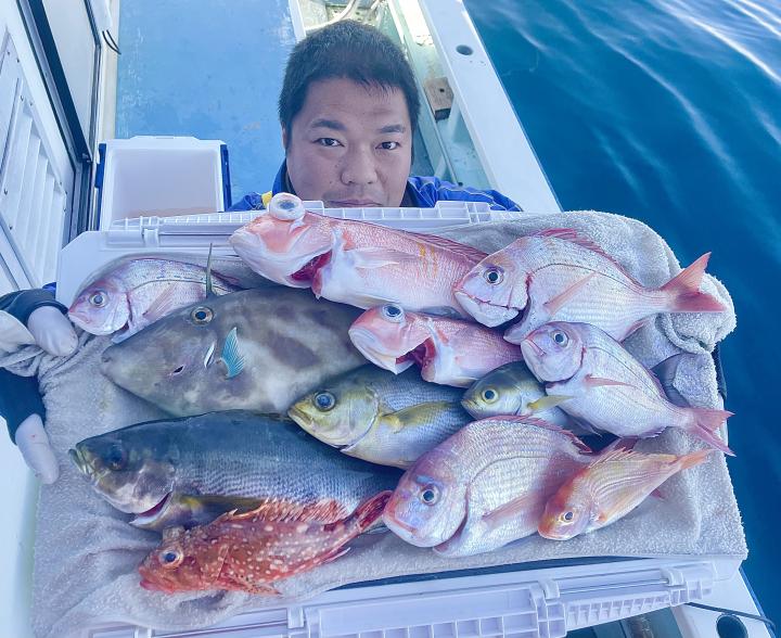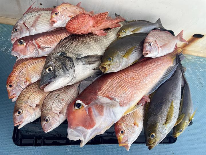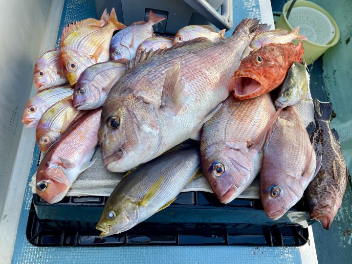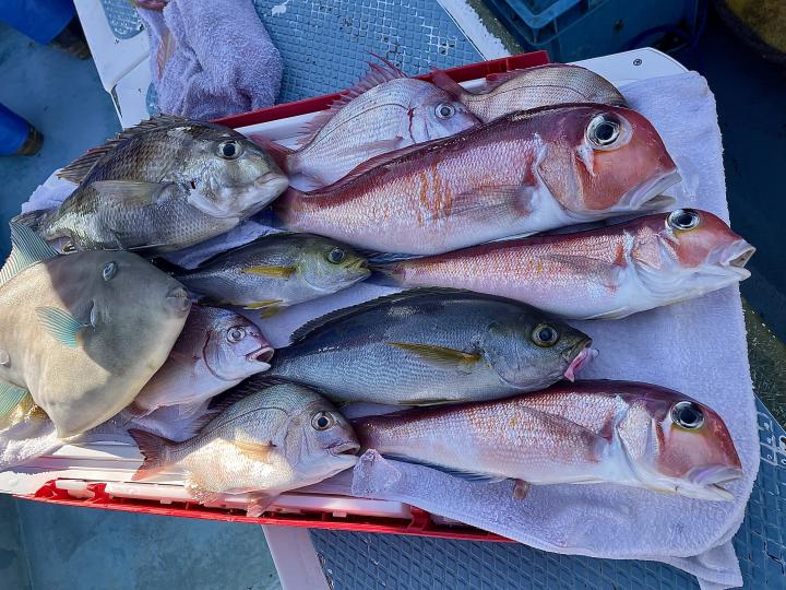 タイ五目(マダイ・ハナダイ・良型イサキ・メジナ・ウマズラハギ等)は澄み潮で魚達は警戒心MAX!夜行玉や金針、太ハリス等 派手な仕掛けはアタリ少なく、逆に細ハリスや針の色までこだわった仕掛けを駆使したお客様に軍配⤴︎︎ 竿頭Y様 食い渋りの中 魚種多彩にGETはお見事でした(๑•̀ •́)و✧