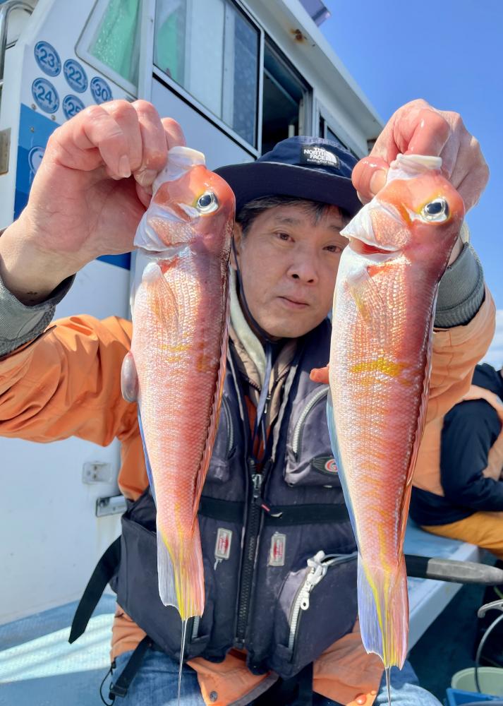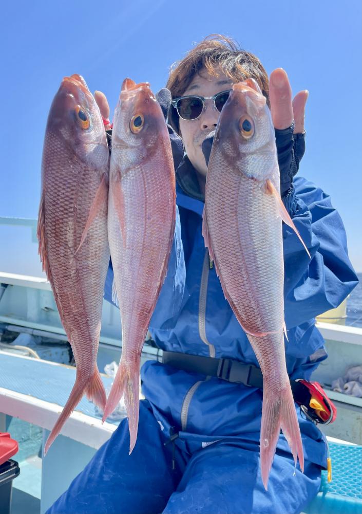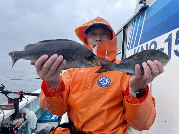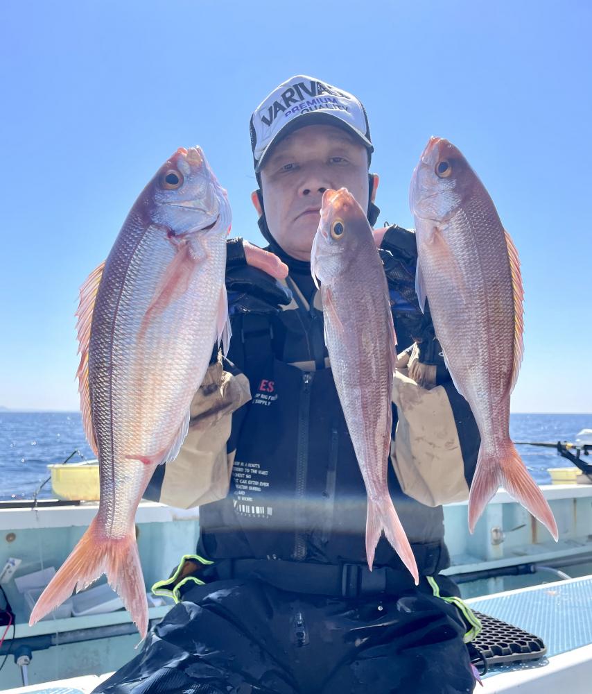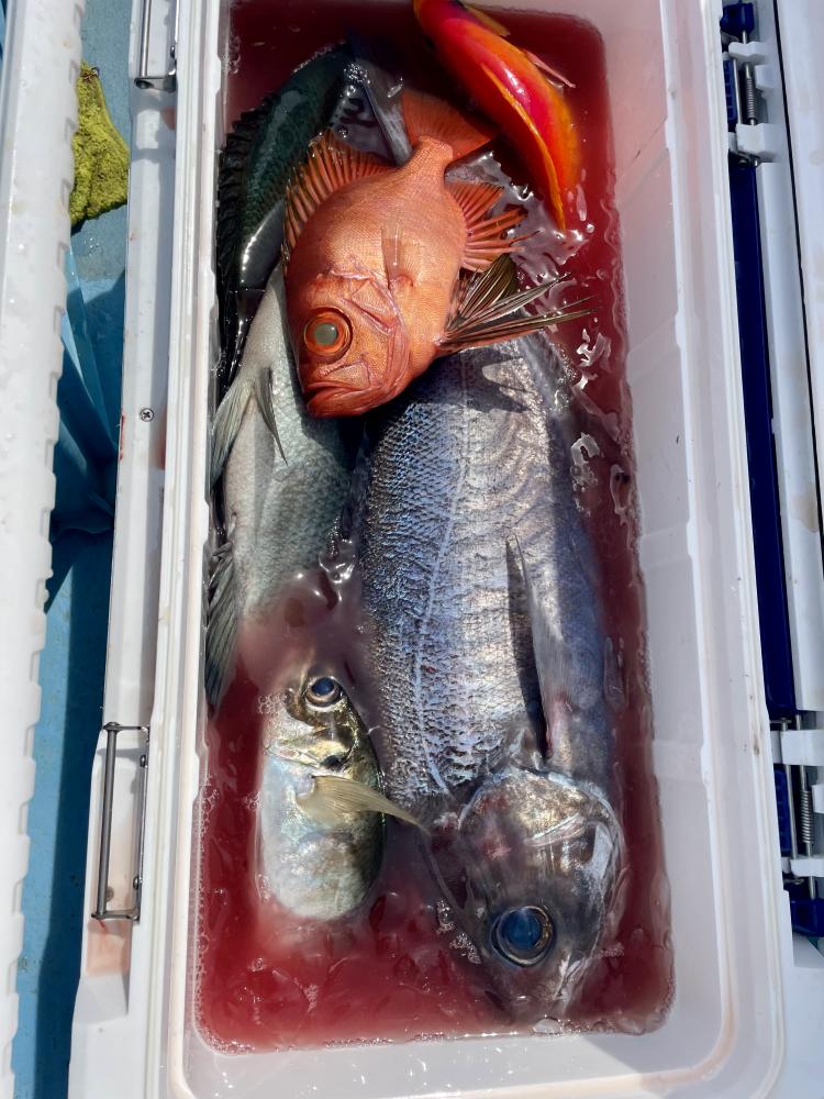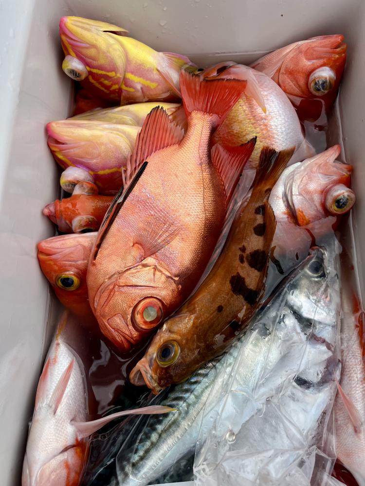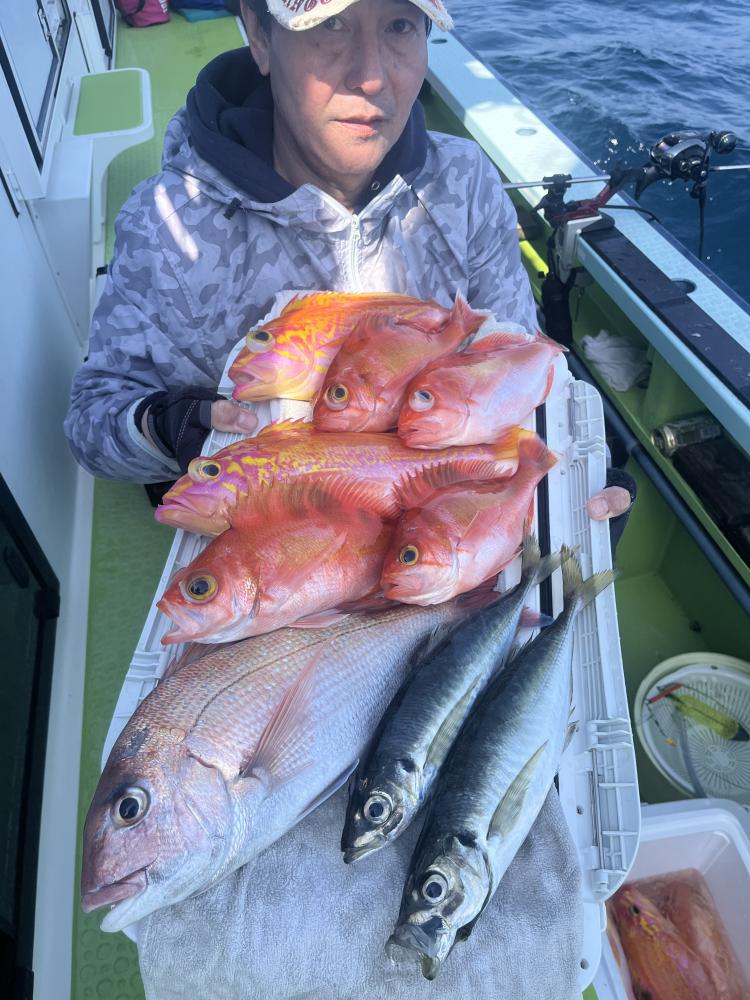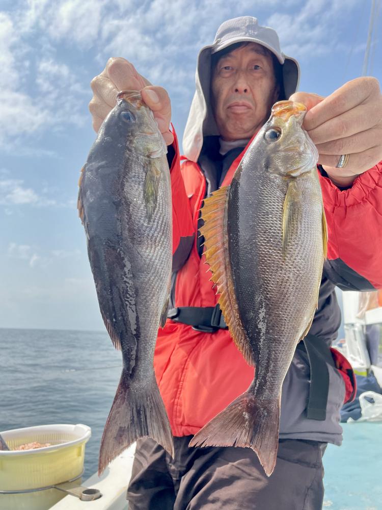 2枚潮速いながら「一流し一投旋回」にてピンポイントでメダイやアカイサキ等の群れに仕掛けを投入〜作戦! メダイ回遊有〜6打数3安打 イカゲソ持参の方にアタリ多く、オキアミエサでもヒットありましたよ! アカイサキも追い食い決まった方は3本針パーフェクトもあり お土産確保出来た方も^^V 他にキントキダイ、大アジ、サバ、オキメバルも。