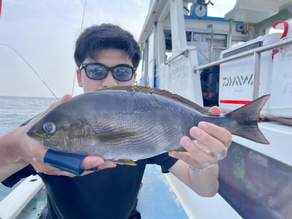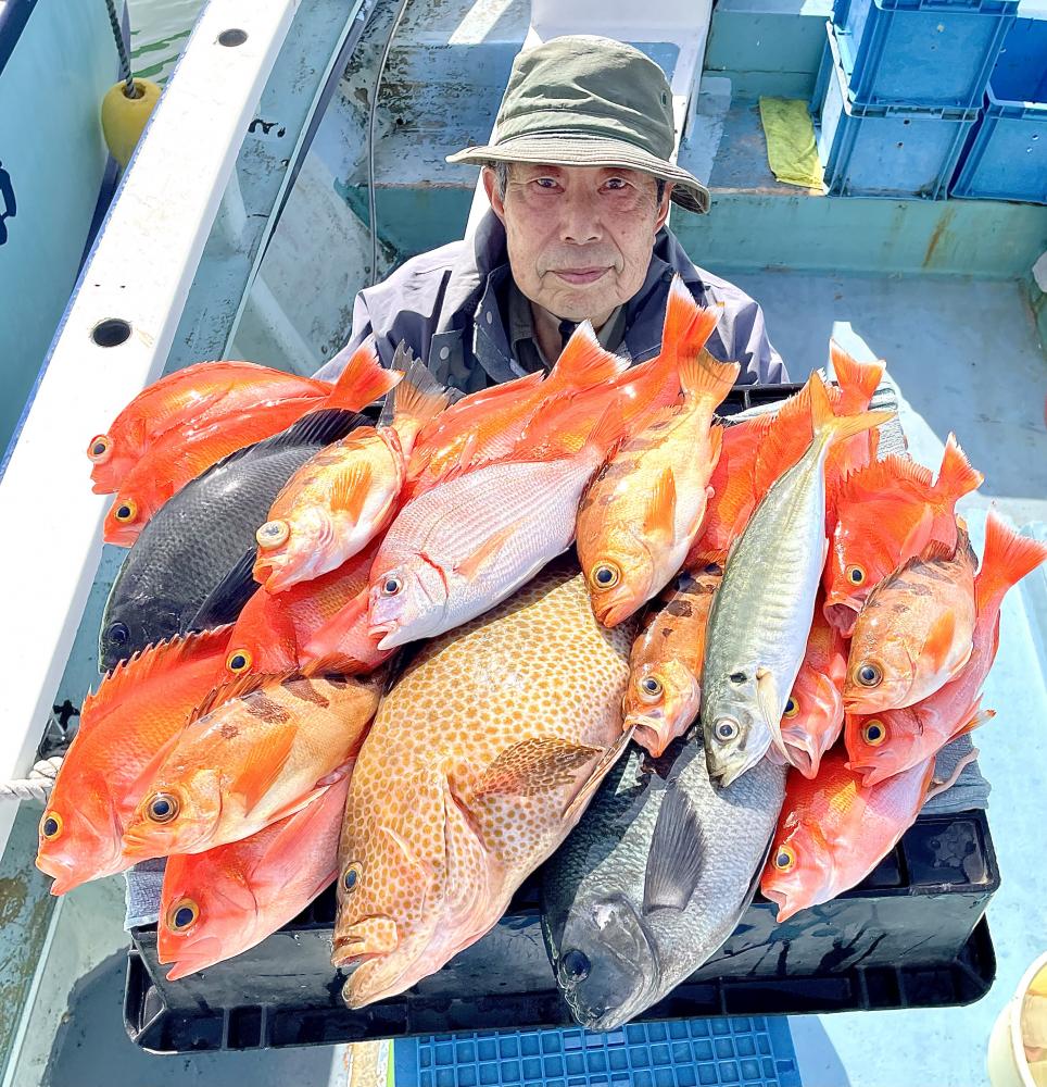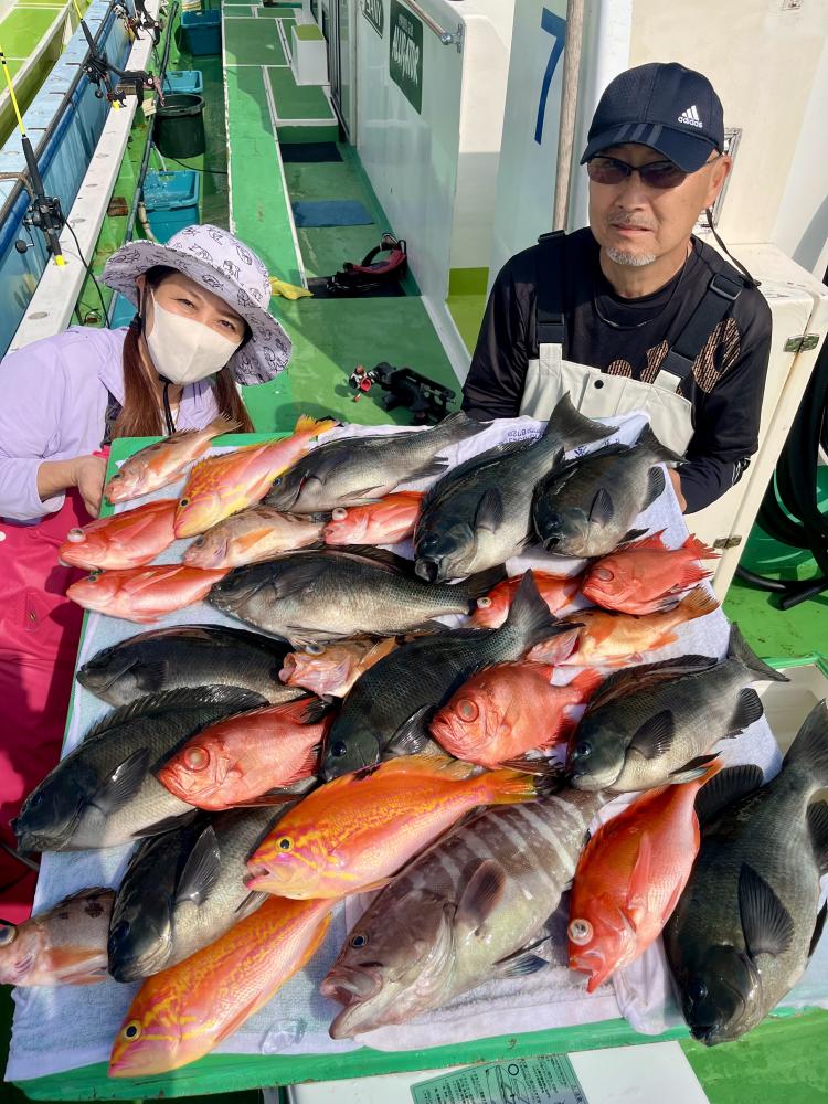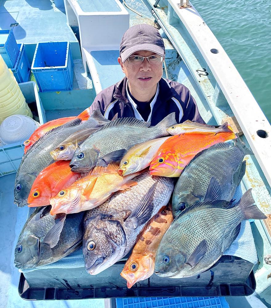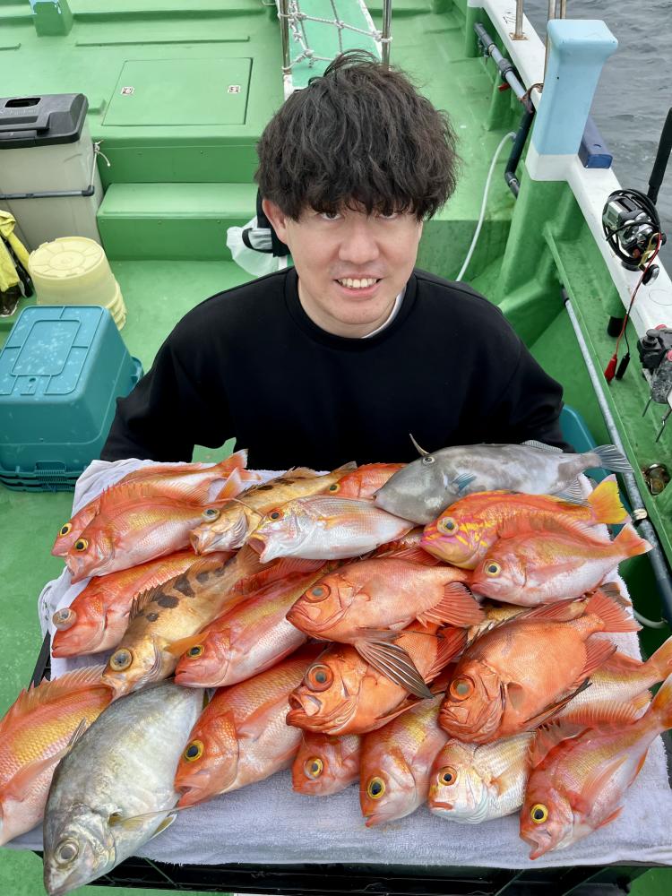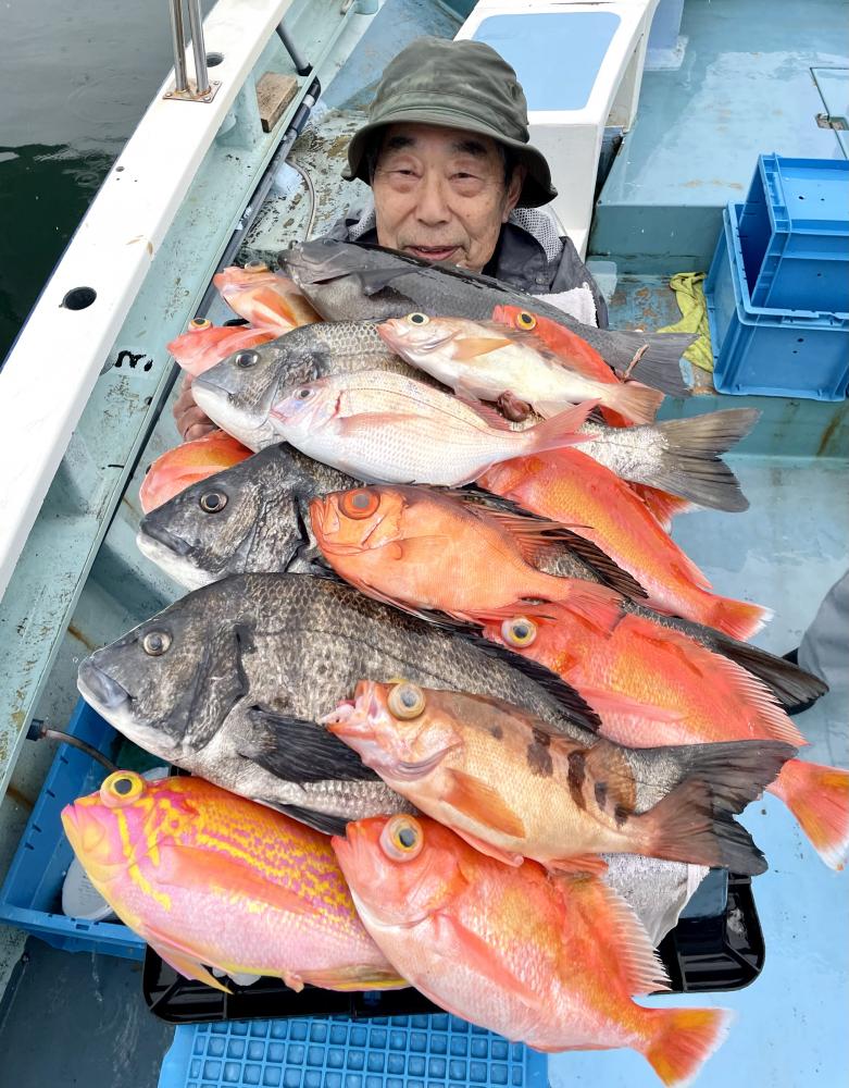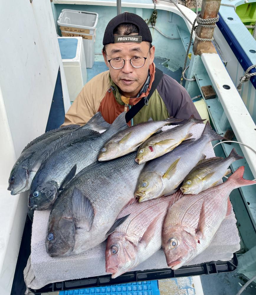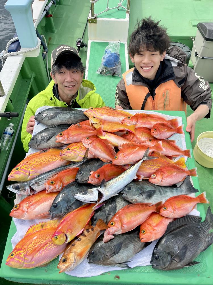 幸い潮流れ緩く一流し一投旋回で 狙ったポイントに仕掛けの滞在時間長く チャンスも増幅⤴⤴⤴ 船内オマツリ多発で 投入回数少なめながらも、大型イサキや大型アカイサキの一荷釣り、良型オキメバル多数、ウマズラハギ、大サバ、ムロアジ、キントキダイと 各魚種ともサイズ良くボリュームあり引き味も楽しめました^^