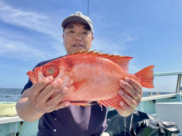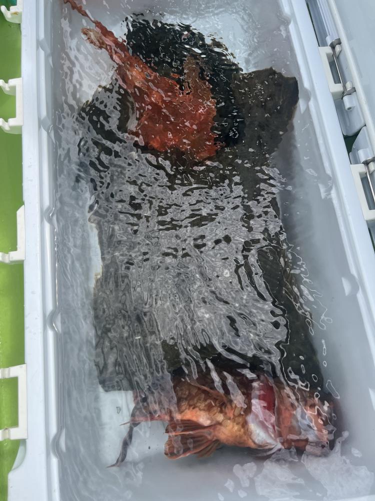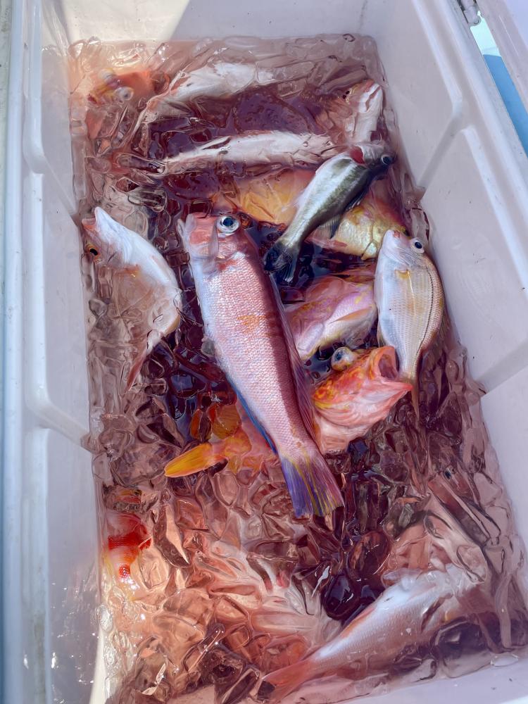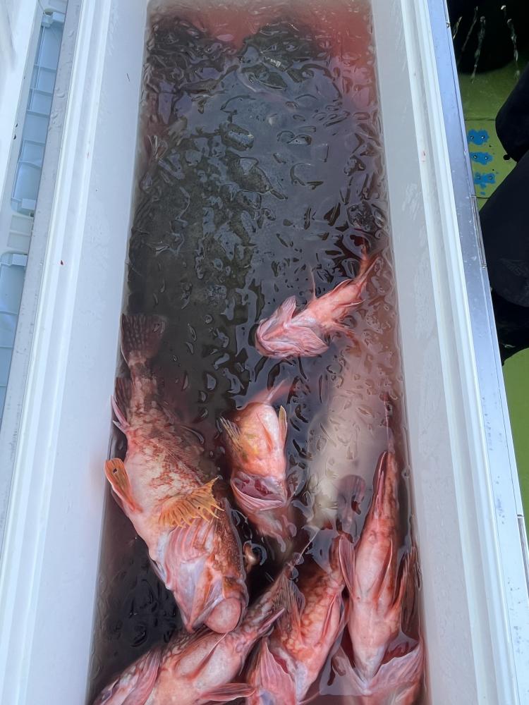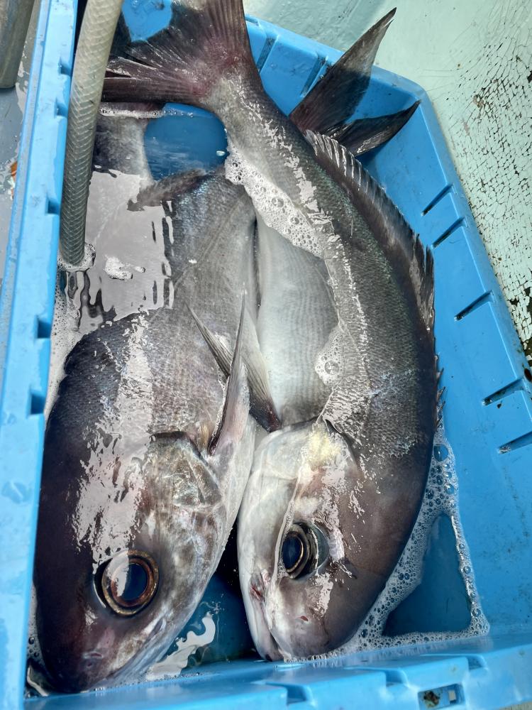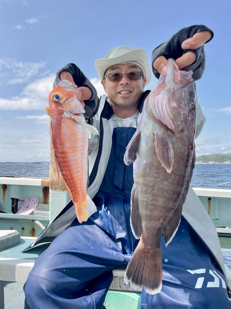 朝、タイ五目⇒シロアマダイと狙いましたが 底潮速く、ウネリも高く底荒れか? 活性低かったので ココで船長〜暴走開始!笑 城ヶ島沖まで一気に走り「コマセ五目」へ変更(๑•̀ •́)و✧ 幸い 潮流れも緩く♪ 海面から100m前後のタナでアカイサキ、オキメバル3本針パーフェクトの方も◎ さらに!メダイ!3.3kgマハタ!キロ級のマハタも浮上⤴︎ キントキダイも混じり お土産キープ成功( ´∀`)b