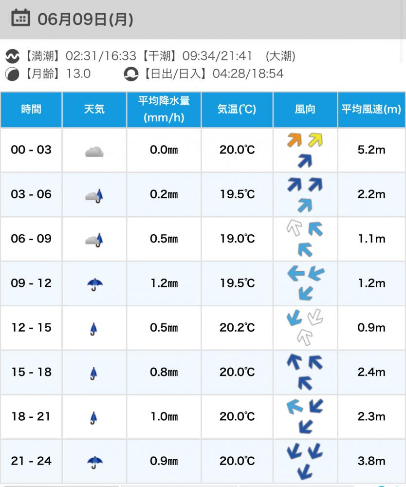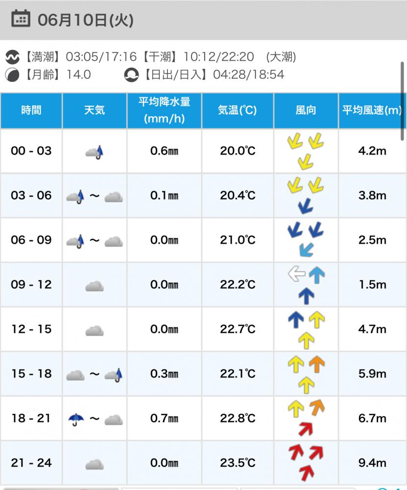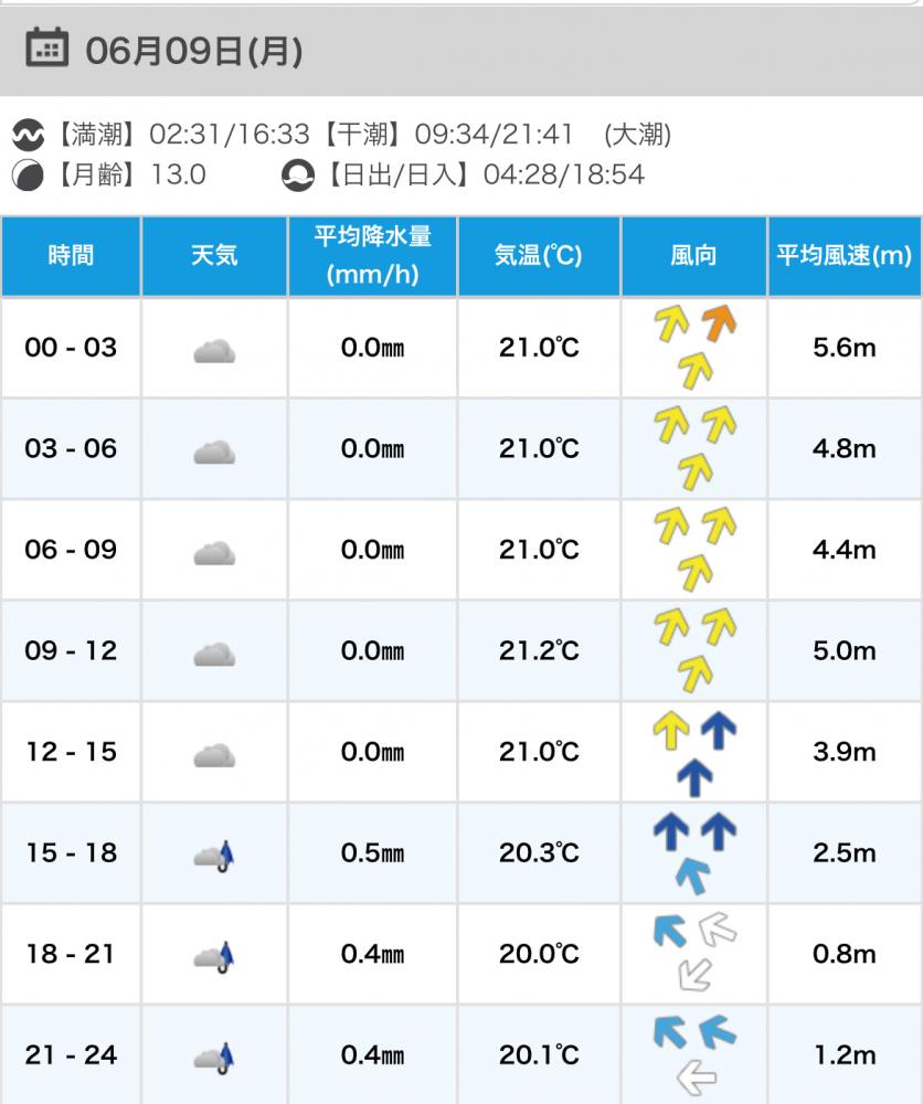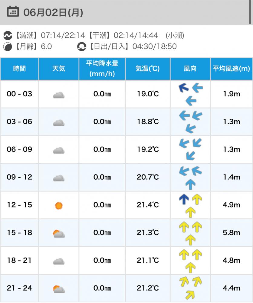 風向きと強さ:南西 弱い→南西 ほどほど