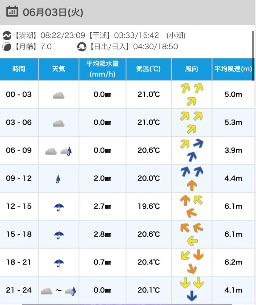 風向きと強さ:南 弱い→南西 強い