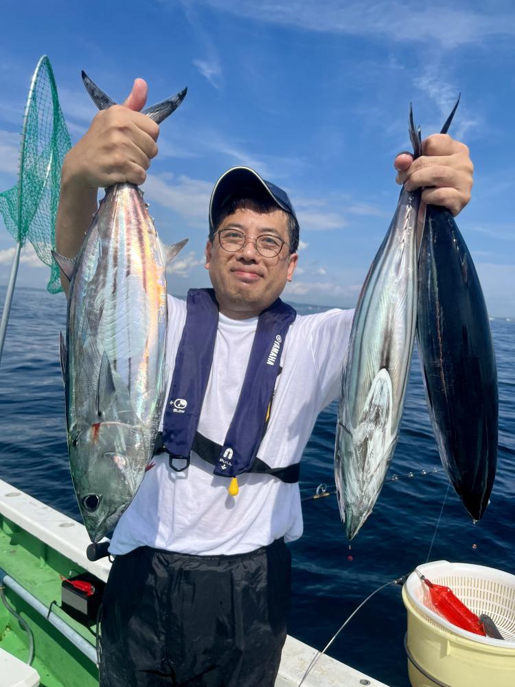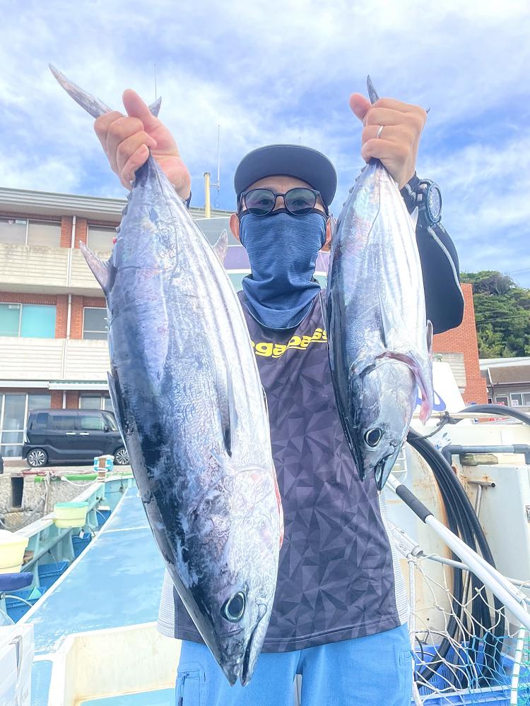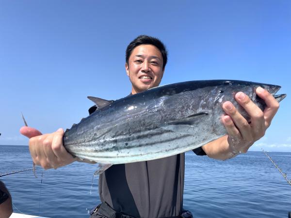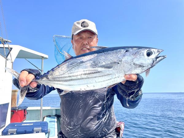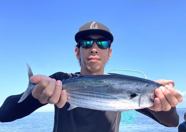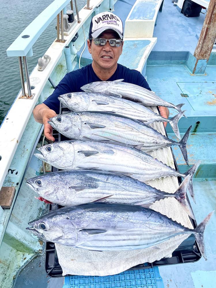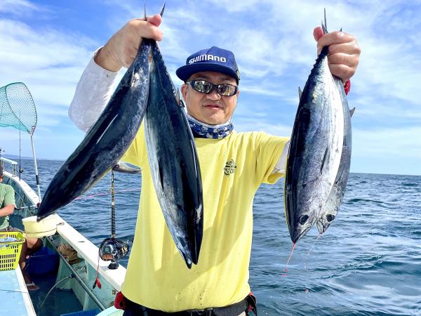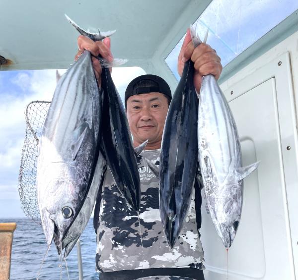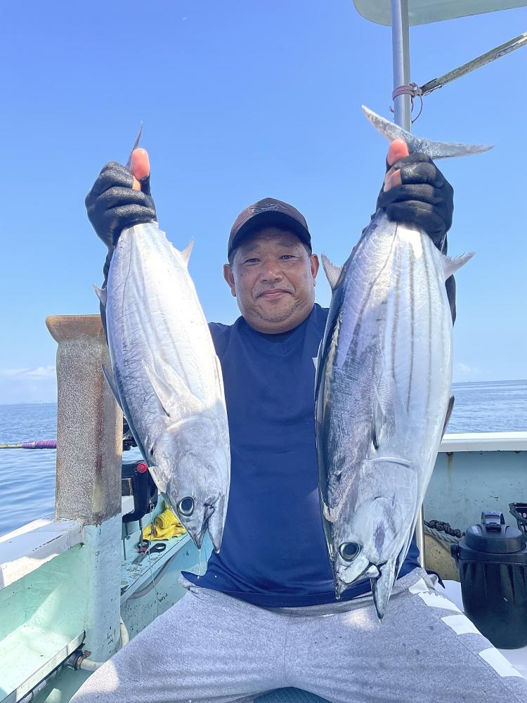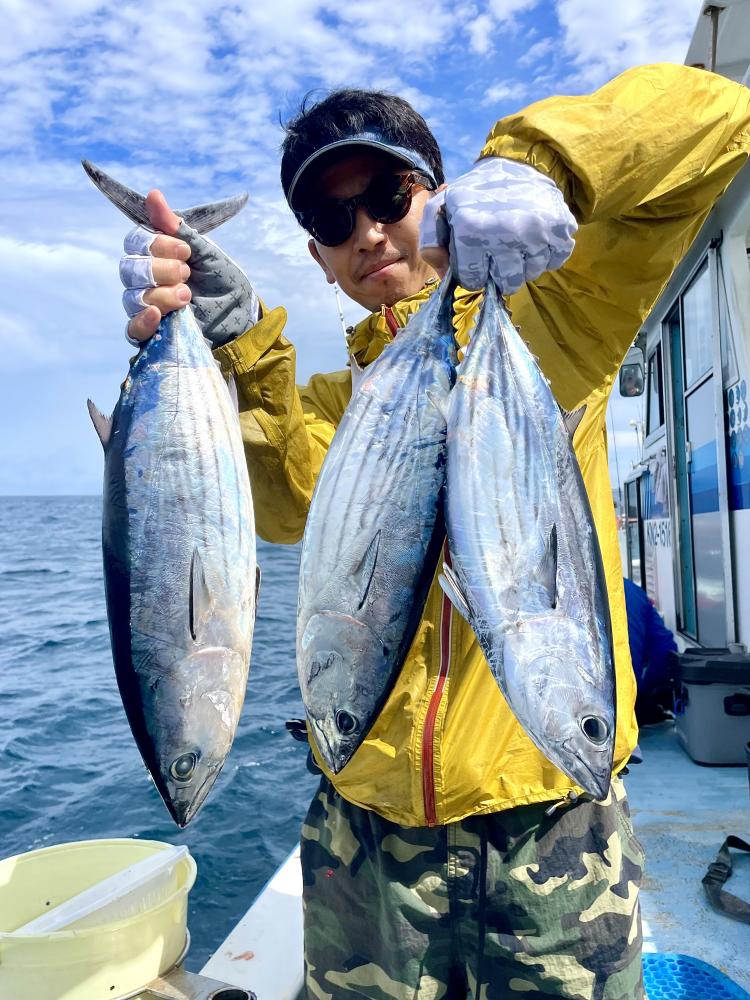 台風通過直後で 朝こそ ナブラ浮き悪く クルージングでしたが、台風前とほぼ同じ海域で ナブラ浮上⤴ カツオ&マグロの混合ナブラ! 船団合流1投目から 良型カツオGET開始(๑•̀ •́)و✧ その後も動きの早いナブラを追っかけ 追釣成功〜◎ そのナブラは結局最後まで沈まず 追っかけ釣り続行!! 途中 エビングでマグロヒットも道糸切れ(PE5号)残念… コマセマグロもヒットありましたが ファーストランで針外れで バラシㅠㅠ 他の船でもエビングマグロ・コマセマグロGET船ありました! 終盤 再びカツオ追加で トップはM様【4打数4安打】バラシ無しはさすがでした!!