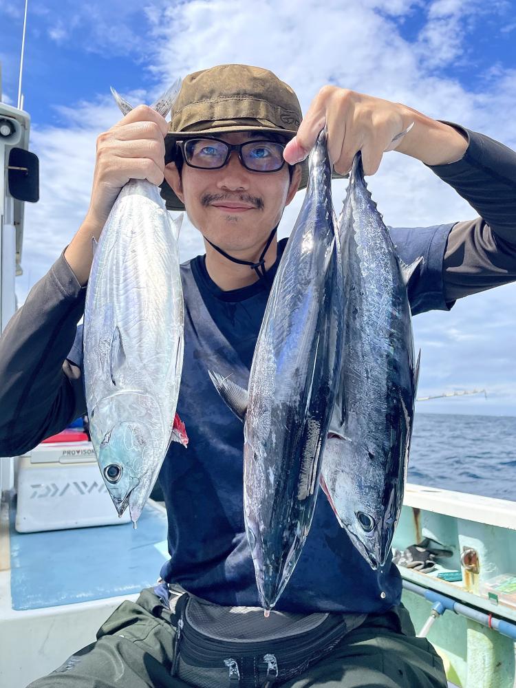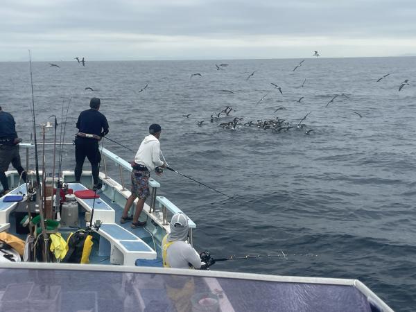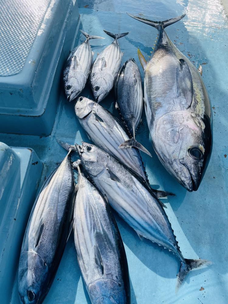 ナブラ発見まで港から1時間半 ソナーにマグロの反応発見!キャスティングルアーで誘い出し ボコっと姿見せましたがフックオンせず残念… その後すぐ近くで再び巨大ナブラに遭遇!! タナ20~100m 縦に長い群れで表層カツオ・中層~マグロの混合ナブラでした⤴⤴⤴ コマセでカツオにヒット&GET! しかし 道糸切れやハリス切れ等で数伸びず残念(泣) ハリス14~16号3~4mオススメ! 他の船では バリバリとカツオGET船もあり チャンスタイム盛り上がりました! 日中は深く潜る挙動不審のマグロのみで ヒット無く 風も強まり少々早上がりでした。今後もナギ日和に ナブラを探し 追っかけて釣りましょうー(๑•̀ •́)و✧