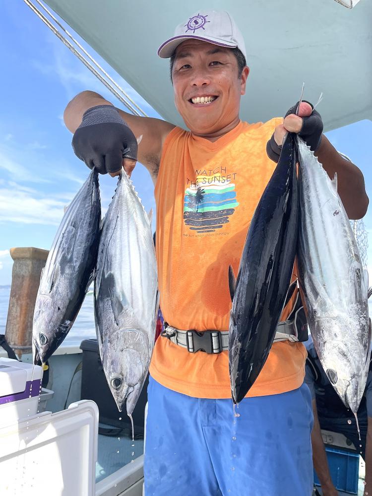 日中~追っかけカツオマグロに合流させて頂き、カツオ&最大11.3kgキメジ(マグロ)が バタバタっと当たり盛り上がりました^^