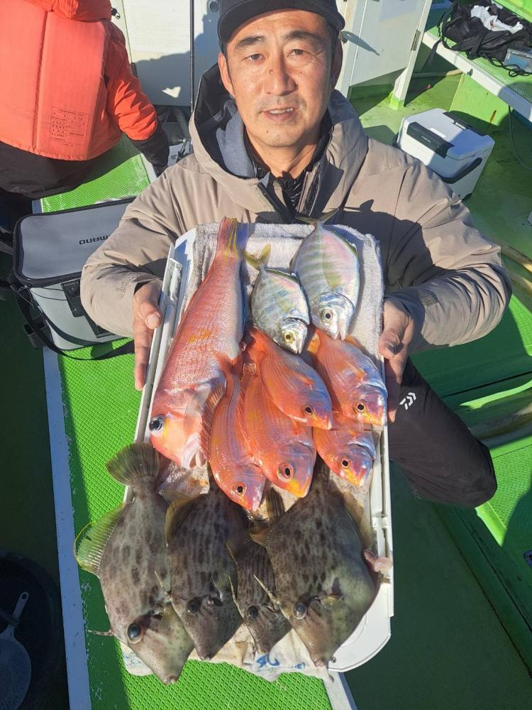 今日は前半カワハギ狙いで後半はアマダイ狙い。カワハギ、アマダイ、キダイ、カイワリ、ホウボウ、サバなどが釣れ一日楽しめました。